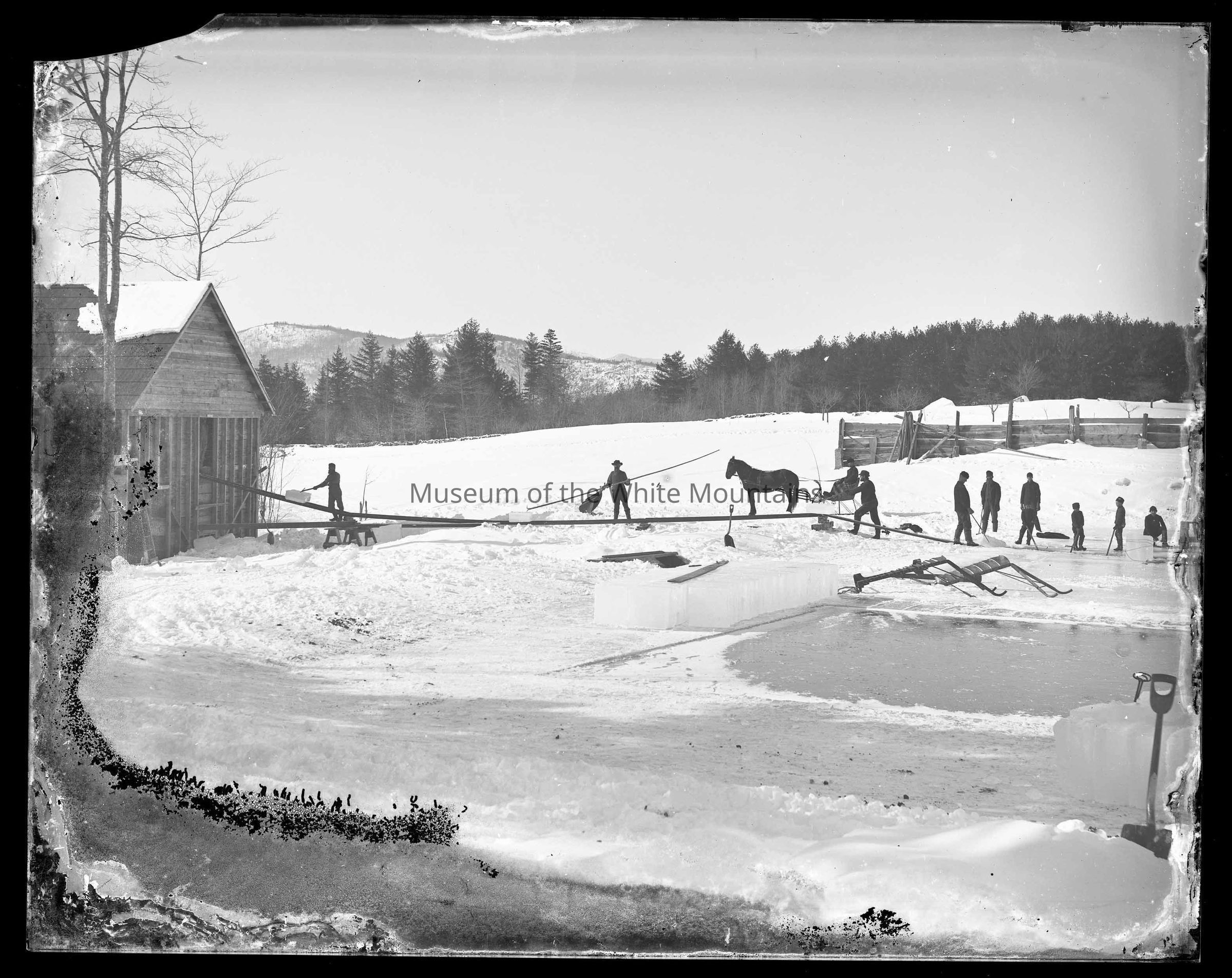 View of farmers, with their horse, pulling ice out of a pond and moving it into their barn.