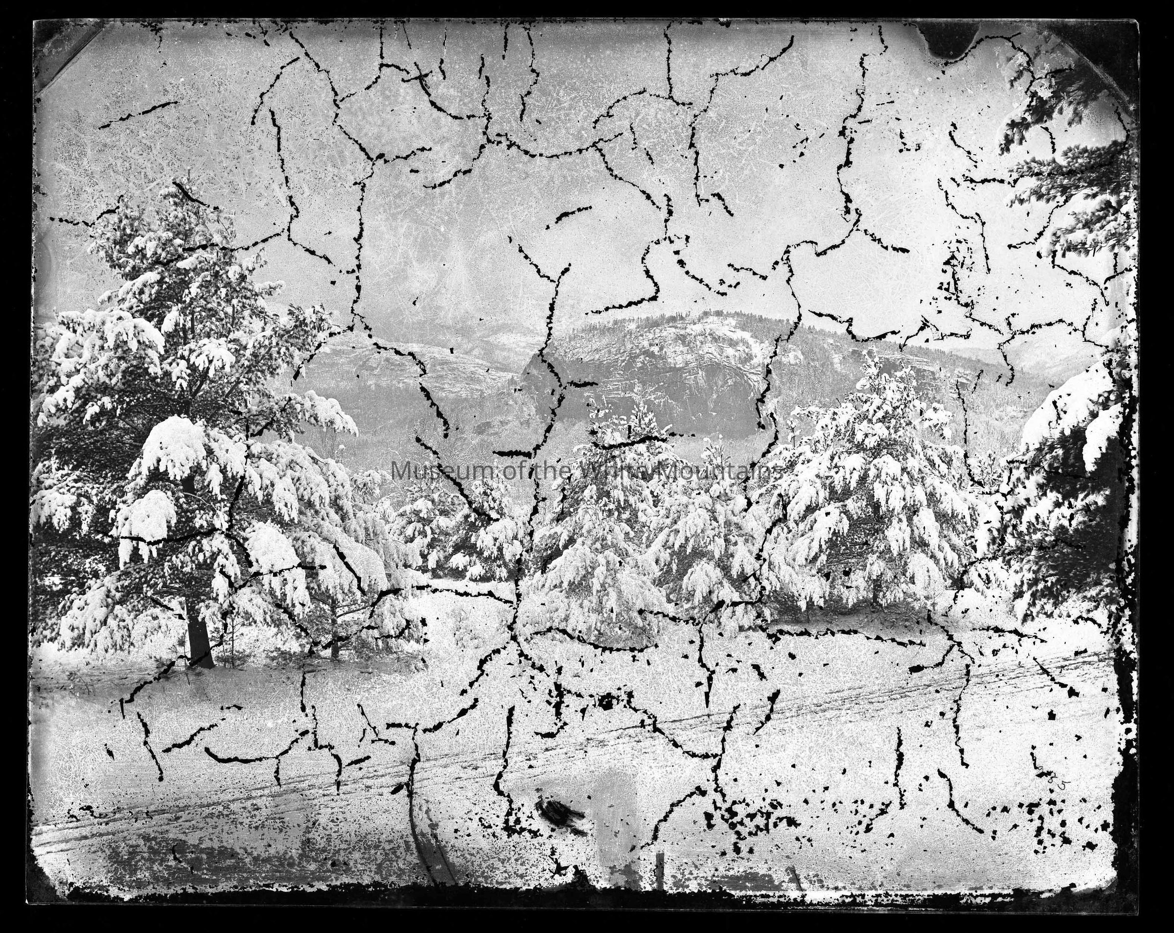 View of coniferous trees covered in most likely fresh snow, with a mountain in the background.
