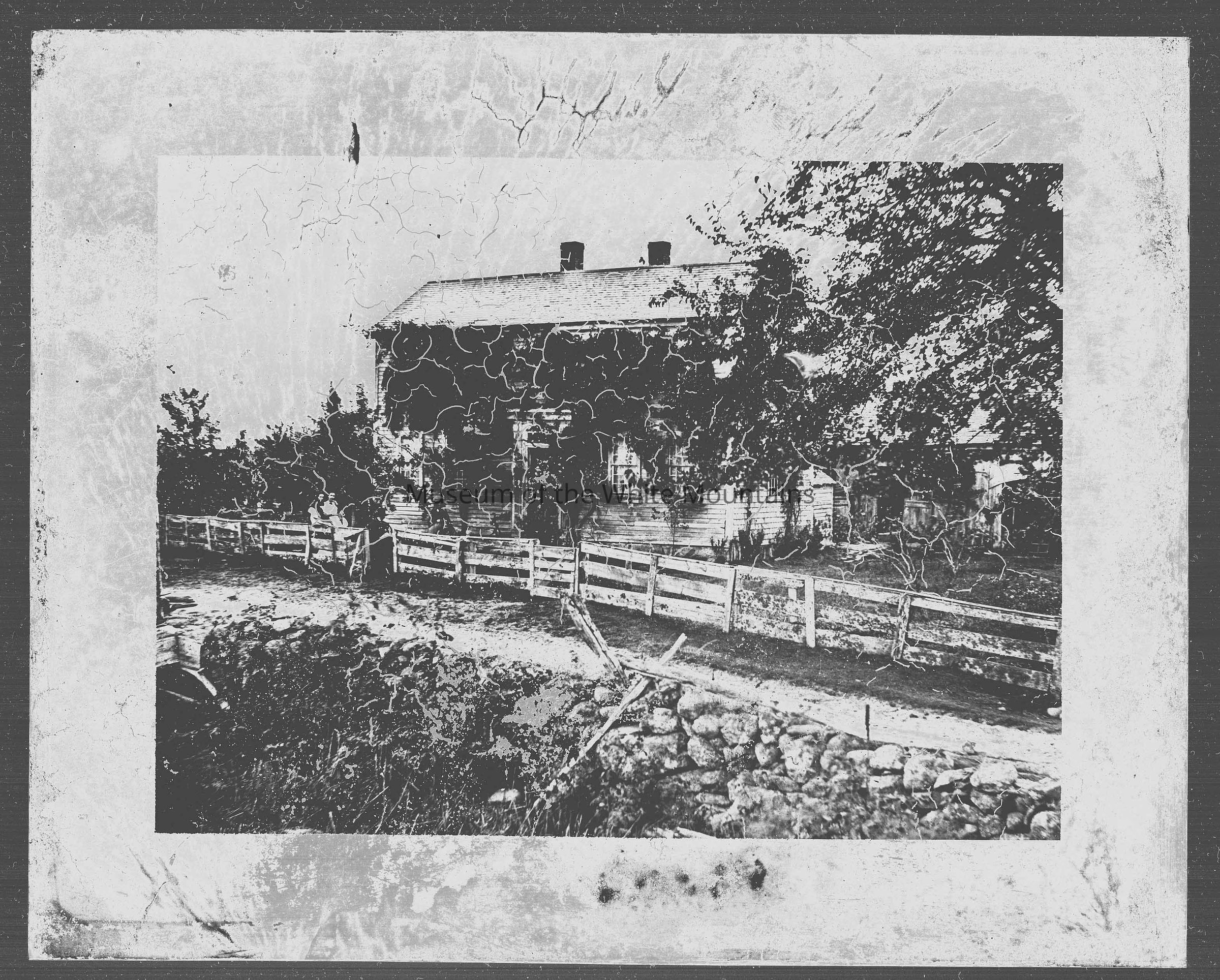 View of a house with ivy on the front of it. There is a fence in the front yard, with a dirt road out front, and trees around the house. There are two women in the front yard, and a shed in the back.