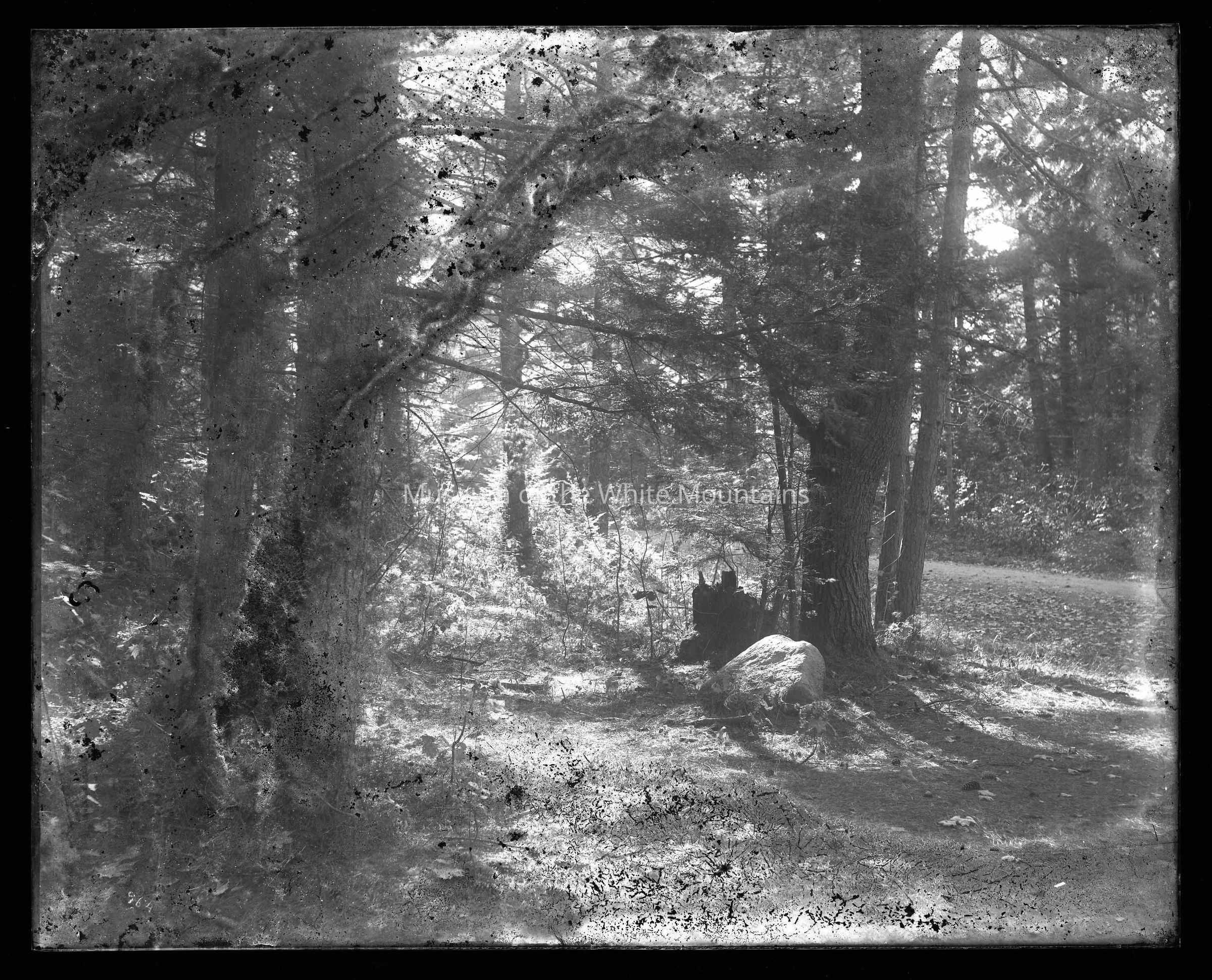 View of a sunlit forest path. In the corner of the image the number 964 is etched.