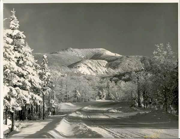 Black and white view of a snow covered mountain after a snow storm. Photo taken from the road. The road has been plowed.