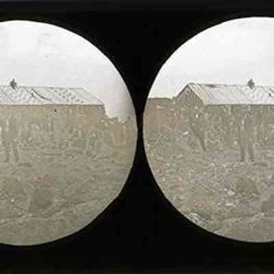 Glass stereoview transparency. A group of men and women sit and stand in front of the Summit House on Mount Washington. One man is sitting on the roof of the house. Image is faded.