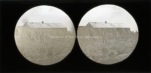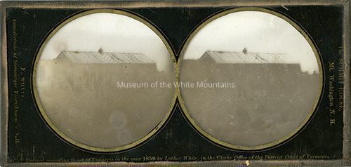 Printed on the glass in gold lettering: on the left: "F. White, manufacturer of Stereoscopic Views, Lancaster, N.H."; on the bottom "Entered according to Act of Congress in the year 1859 by Luther White, in the Clerk's Office of the District Court of Vermont"; and on the right: "Summit House, Mt. Washington N.H." The photographer, Franklin White, 1813-1870, of Lancaster, NH issued his stereoscopic views on glass slides. He worked with his brother Luther White of Montpelier, VT, and was a contemporary of John P. Soule, Franklin Gage, and a mentor for the Kilburn Brothers.