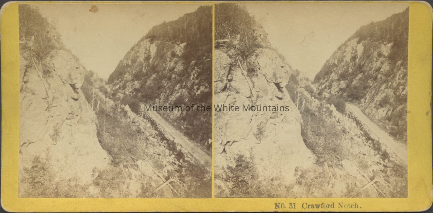 Black and white image of a dirt road among mountain ledges. Caption reads, "Crawford Notch." Back Description: Plain