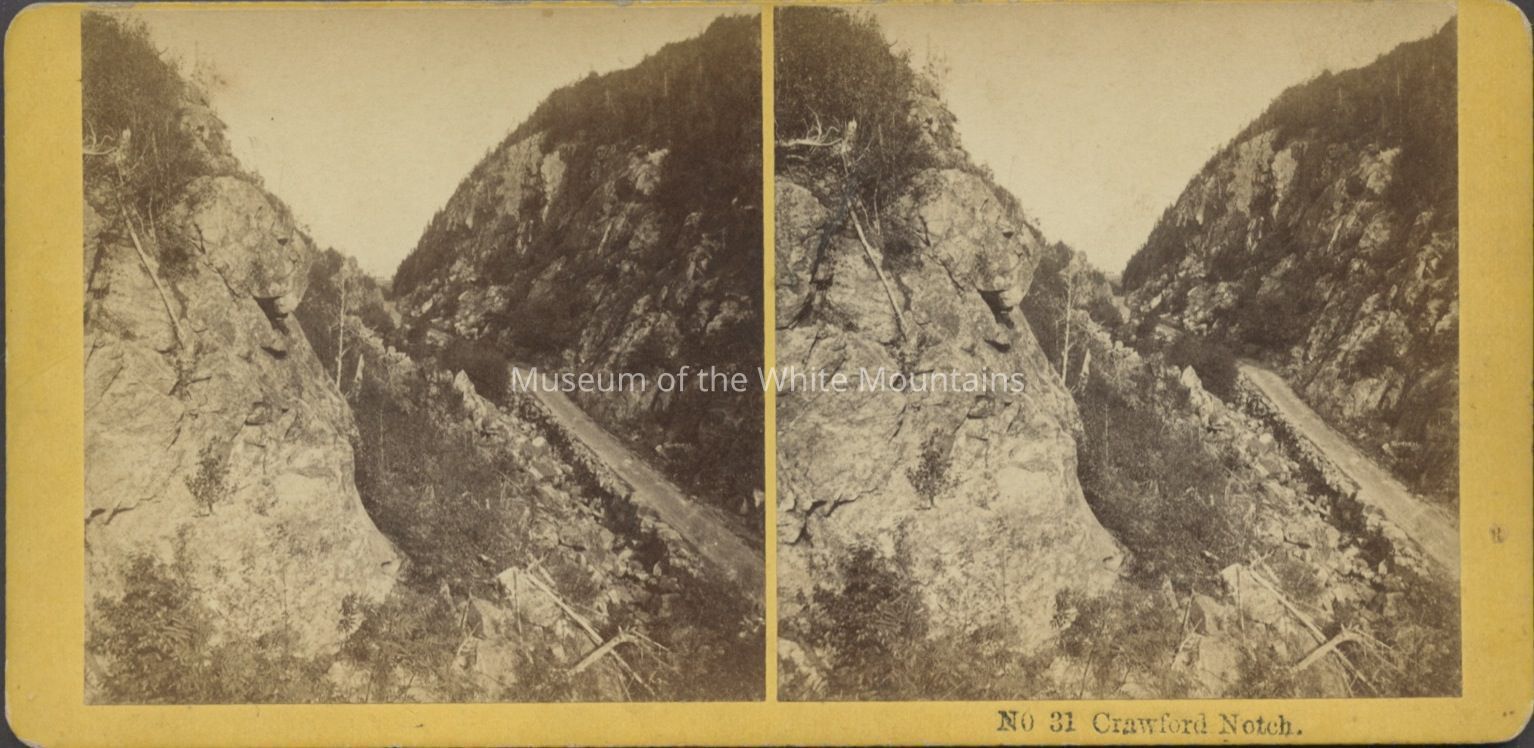 Black and white image of a dirt road among mountain ledges. Caption reads, "Crawford Notch." Back Description: Plain