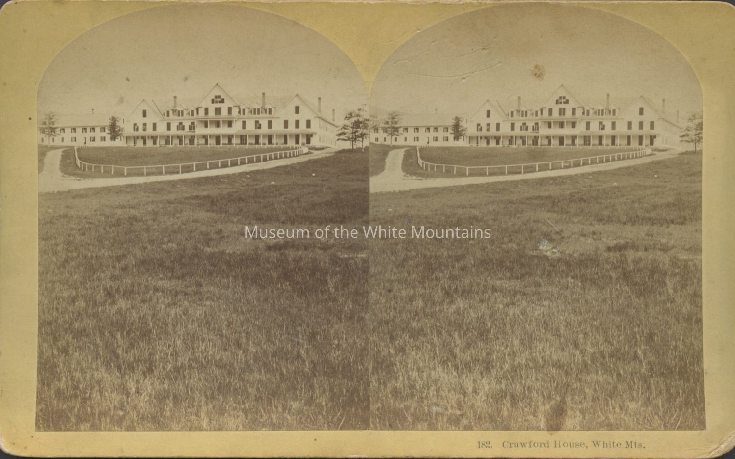 Black and white image of a large hotel with a large porch and three gables with a large front lawn and a dirt path with fence in front. Caption reads, "Crawford House White Mts." Back Description: Plain