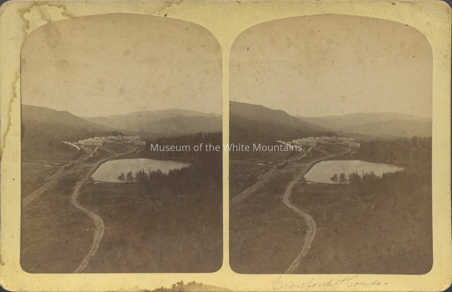 Crawford House (Coos county, New Hampshire : inhabited place), White Mountains (New Hampshire : mountains), hotels, Buildings, railroad tracks, lakes, dirt roads