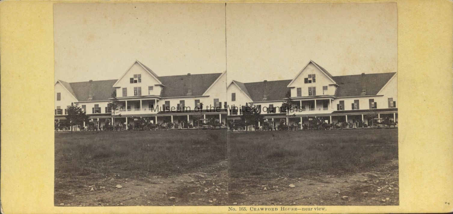 Black and white image of a large hotel with a large porch and three gables with a large front lawn and a dirt path in front. Many people are on the porch. Caption reads, "Crawford House near view." Back Description: "White Mountain Scenery"
