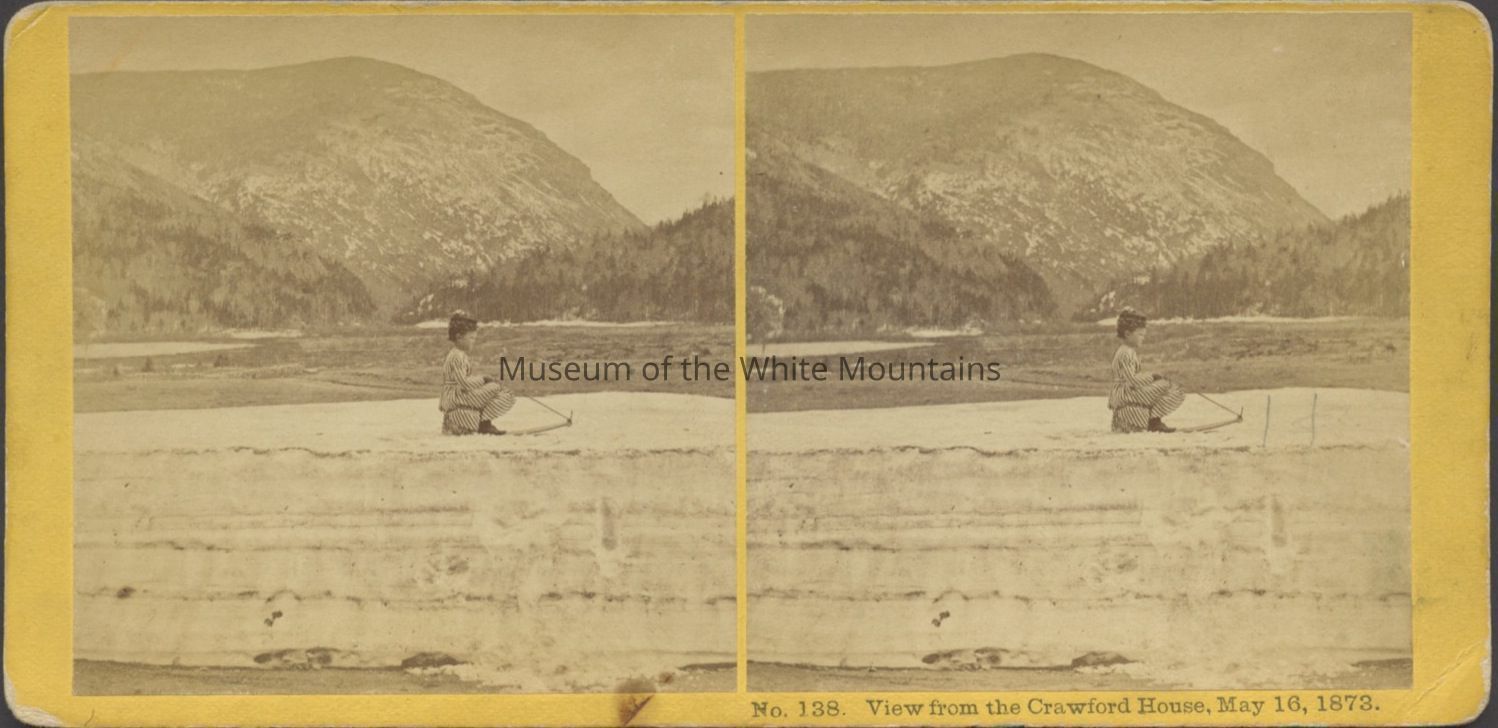 Black and white image of a girl squatting on skis with mountains in the background. Caption reads, "View from the Crawford House, May 16, 1873."