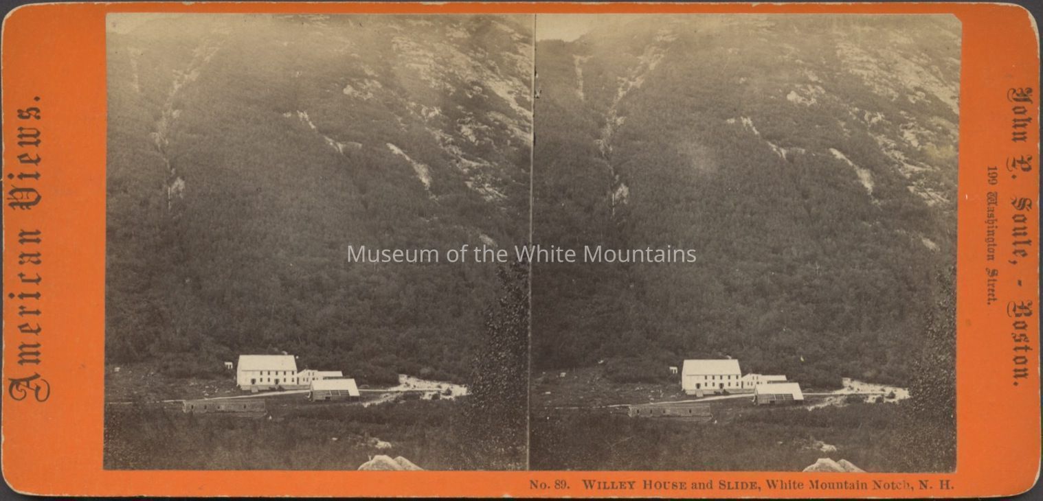 Black and white image of a house and clearing among mountains. Caption reads, "Willey House and Slide White Mountain Notch NH." Part of the "American Views" stereoview series. Back Description: Plain. Purple.