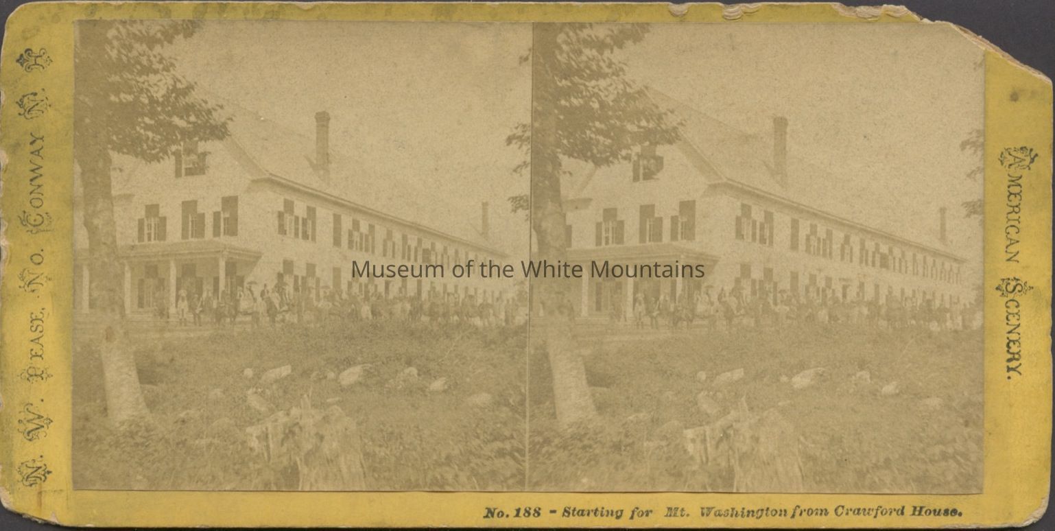 Black and white image of a large, long hotel with its gable end facing ahead. Many people are around the buildings on horses. Caption reads, "Starting for Mt Washington from Crawford House." Part of the "American Scenery" stereoview series Back Description: Plain