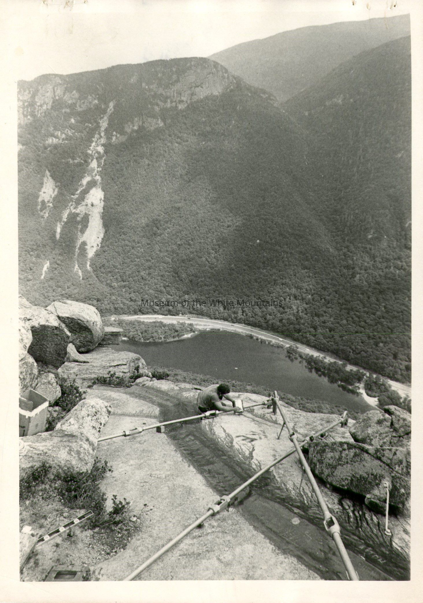 View looking over Cannon Cliff over Profile lake. An individual is seen with what looks like a bucket near the turnbuckles keeping the boulders in place for the Old Man of the Mountain.