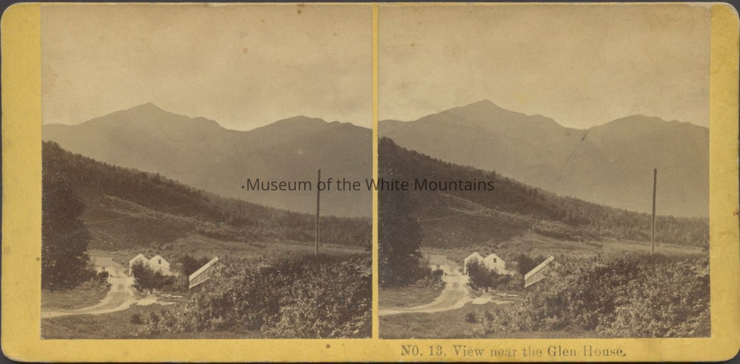 Black and white image of buildings along a dirt road leading into a clearing with mountains in the background. Caption reads, "View near the Glen House." Back Description: Plain