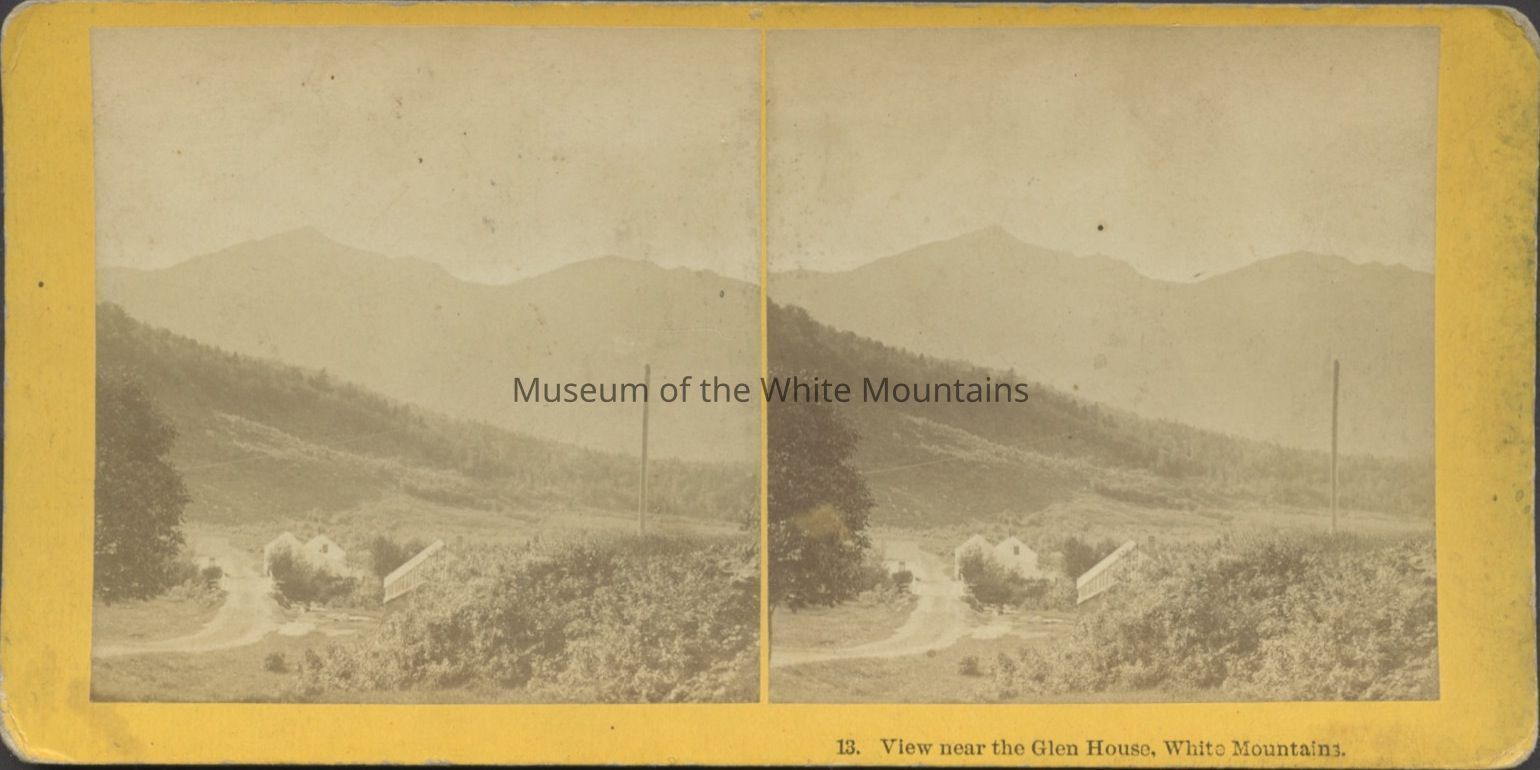 Black and white image of buildings along a dirt road leading into a clearing with mountains in the background. Caption reads, "View near the Glen House." Back Description: Wood-like pattern.