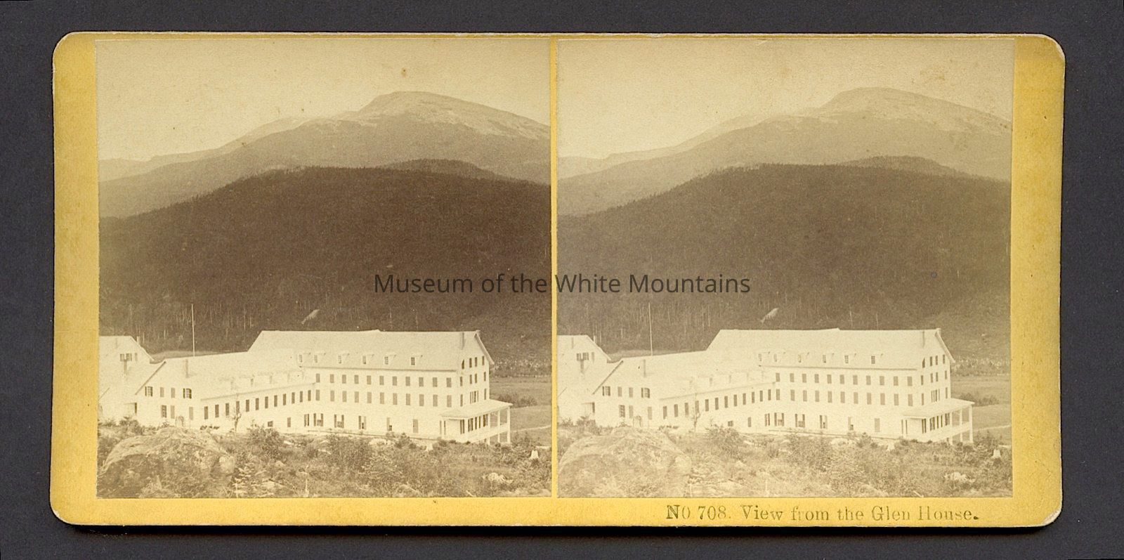 Black and white image of a hotel with gable ends and many dormers. Mountains are in the background. Caption reads, "View from the Glen House." Back Description: Plain