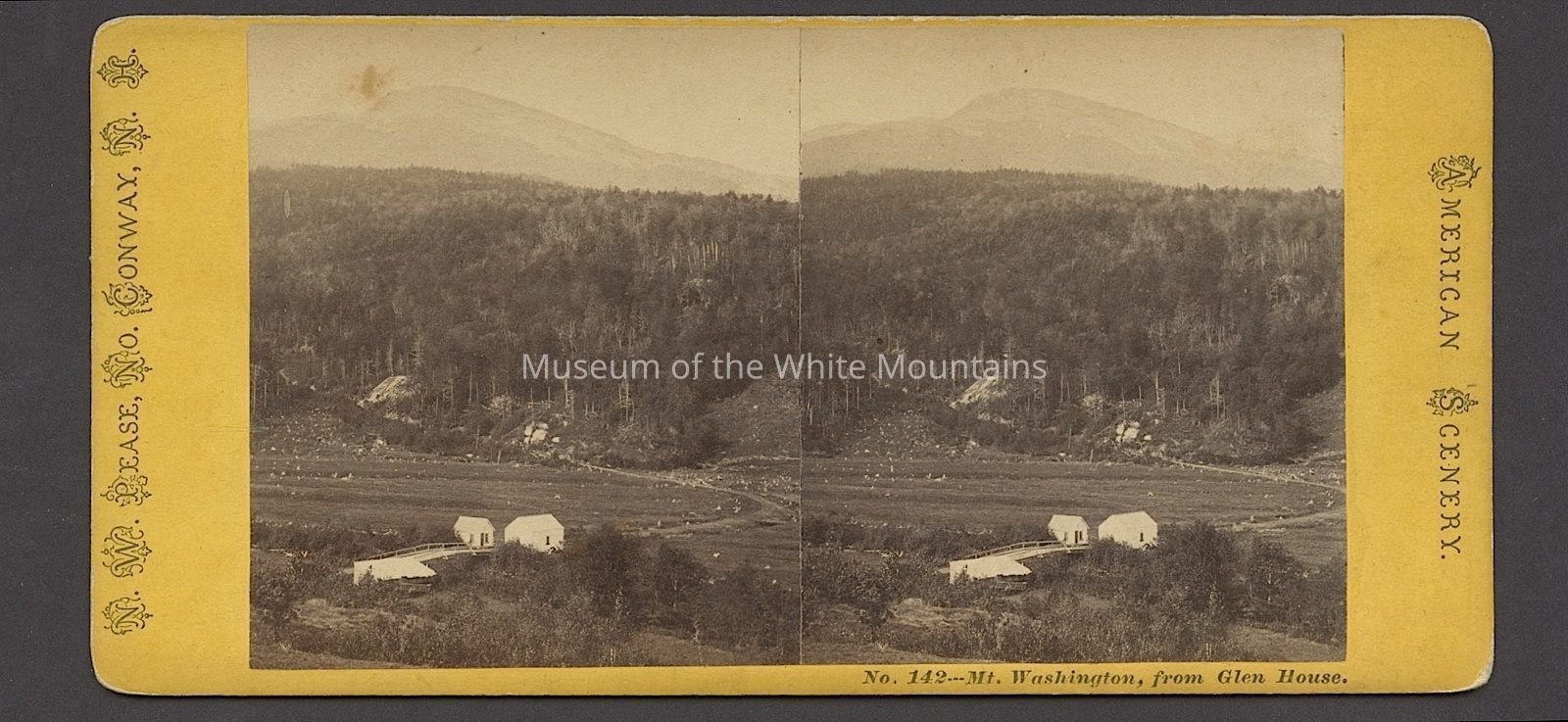 Black and white image of a clearing with a dirt road going through it. Some buildings are along road. Mountains are in the background. Caption reads, "Mt. Washington from Glen House." Part of the "American Scenery" stereoview series. Back Description: Plain