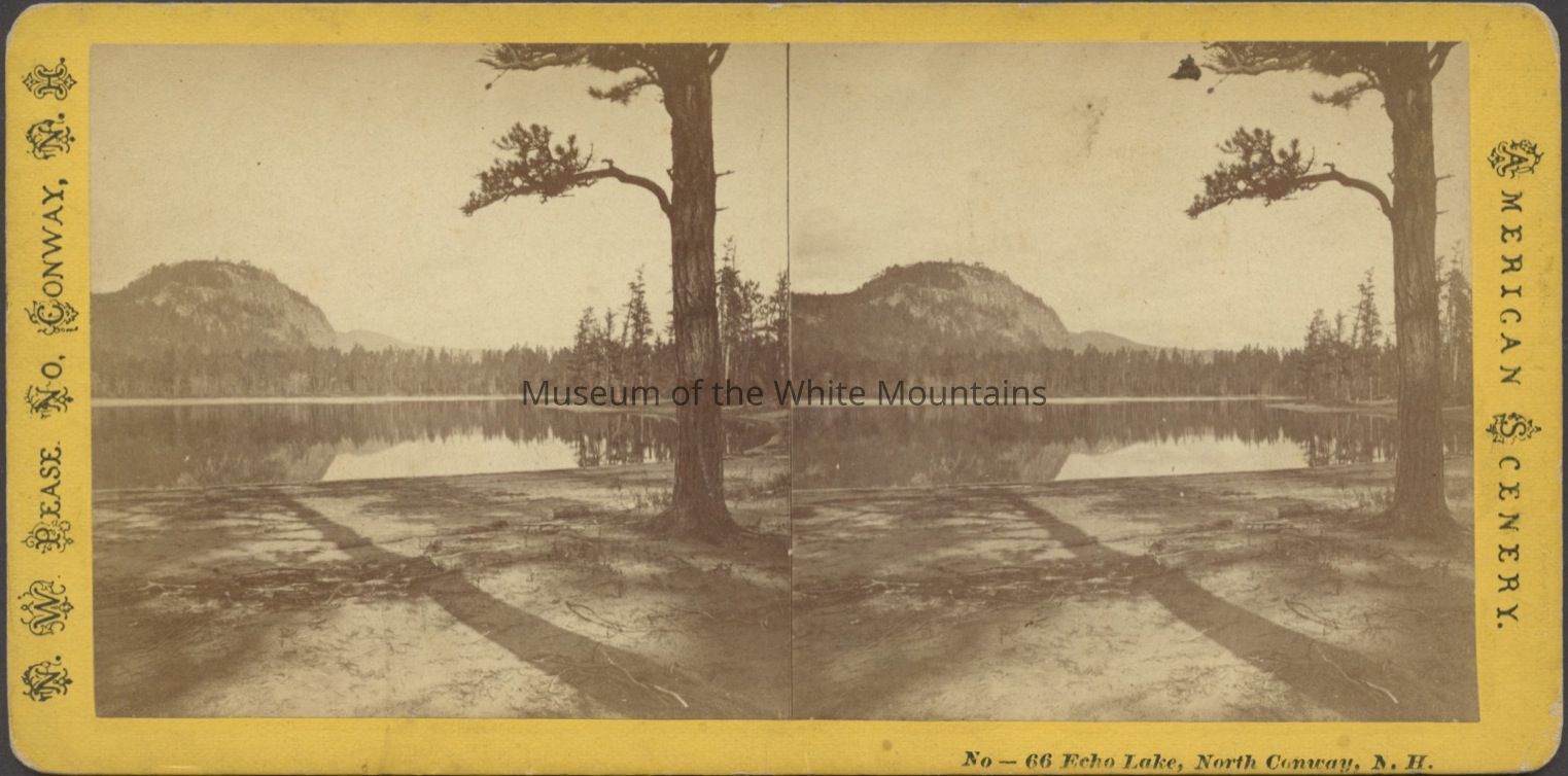 Black and white image of a lake with mountains in the background. Lake is surrounded by trees. Caption reads, "Echo Lake, North Conway NH." Part of the "American Scenery" stereoview series. Back Description: Plain