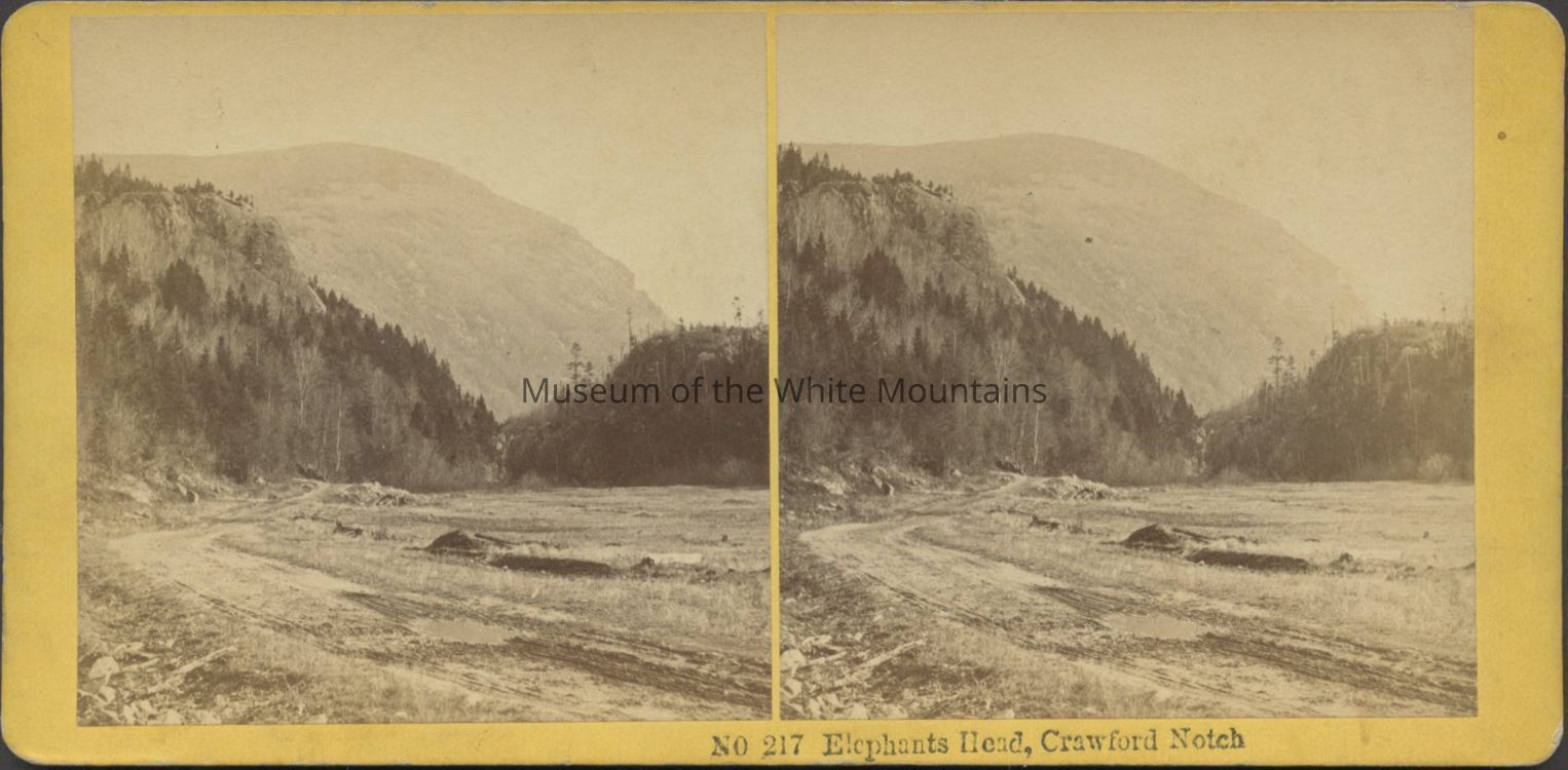 Black and white image of a clearing with a dirt road going through it with mountains in the background. Caption reads, "Elephants Head, Crawford Notch." Back Description: Plain
