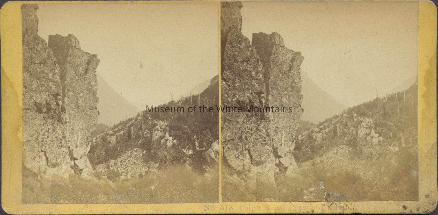 Black and white image of mountain ledges. Caption reads, "Pulpit Rock, Crawford Notch." Back Description: Plain