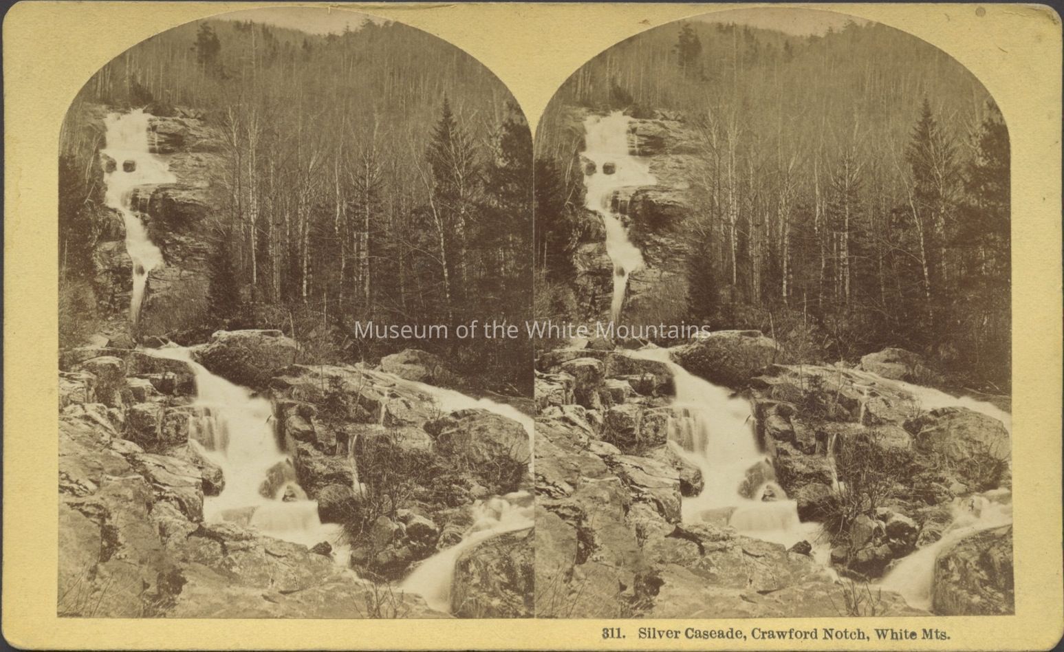 Black and white image of a waterfall among rocks. Caption reads, "Silver Cascade, Crawford Notch, White Mts." Back Description: Plain