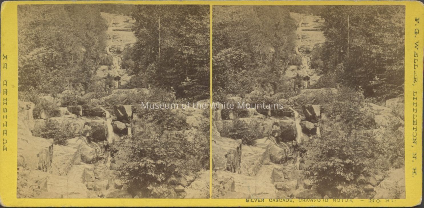 Black and white image of a waterfall among rocks. Caption reads, "Silver Cascade, Crawford Notch, White Mts." 3. Back Description: Plain