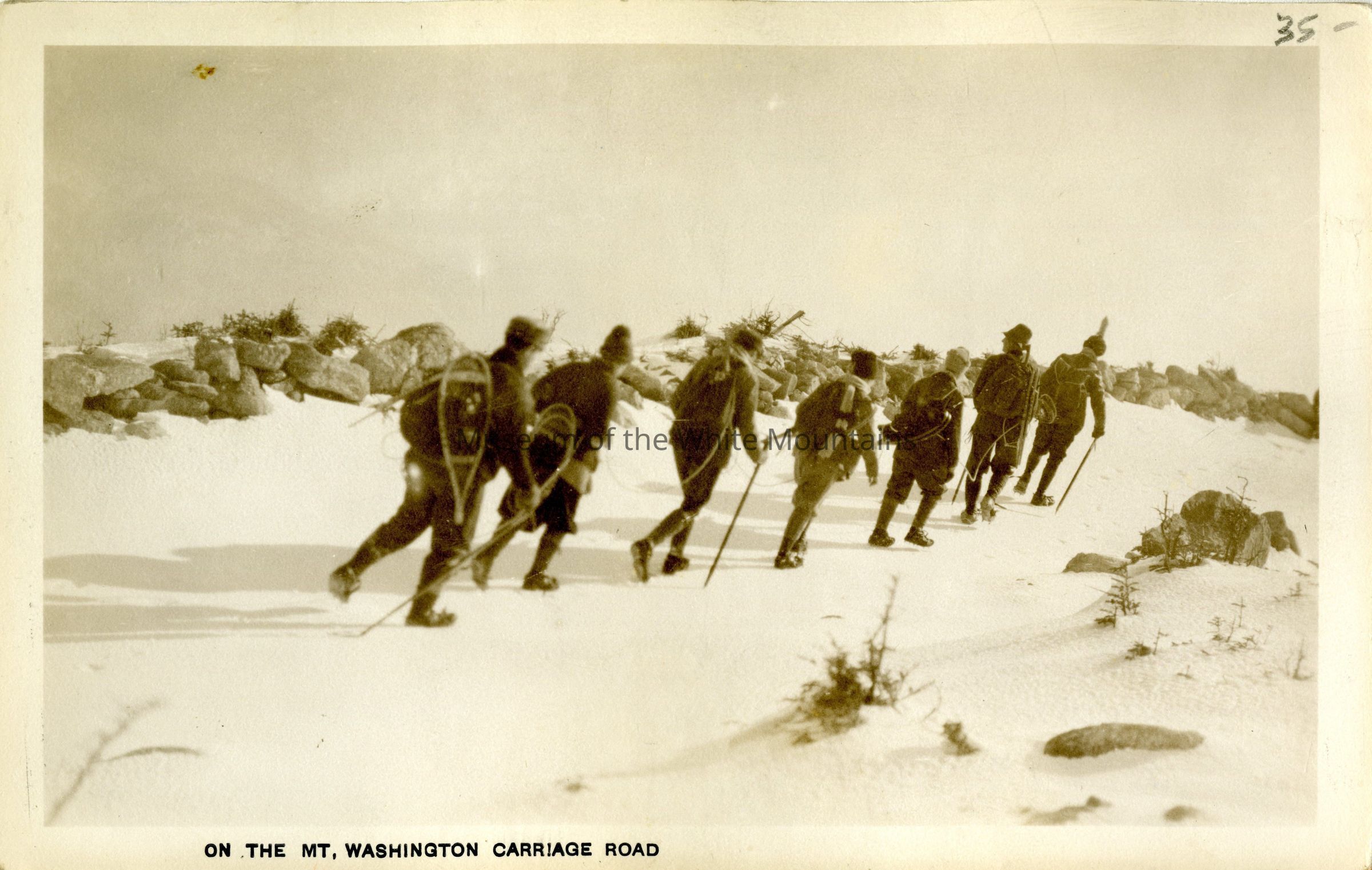 Front: Picture of winter hikers walking in single file on the Mt. Washington Carriage Road. They are equipped with snowshoes, trekking poles, and other winter gear.