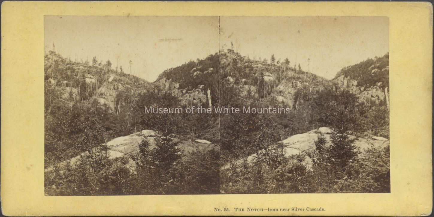 Black and white image of a rocky mountain with trees. Caption reads, "The Notch-from near Silver Cascade." Part of the "White Mountain Scenery" stereoview series. Back Description: "White Mountain Scenery"