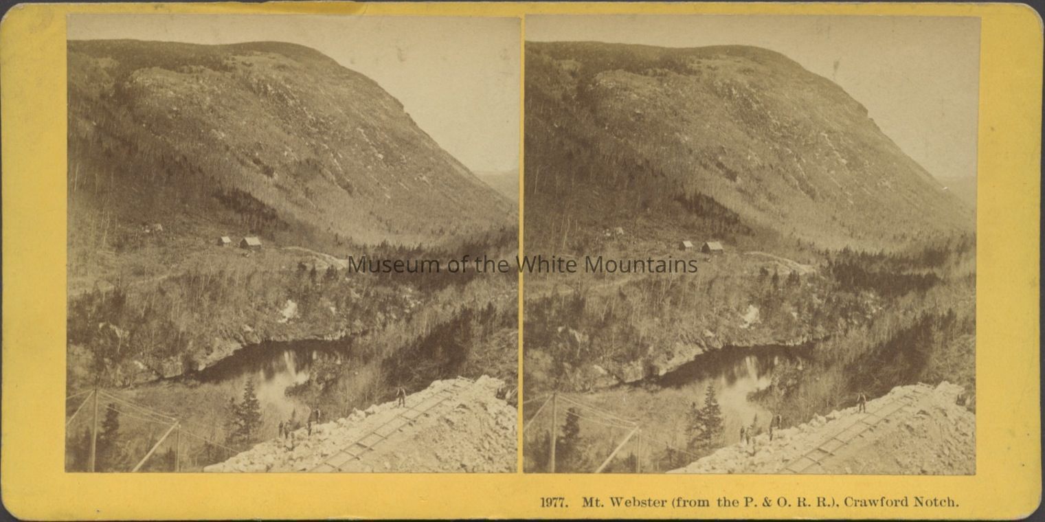 Webster, Mount (Coos county, Carroll county, New Hampshire: peak), Portland and Ogdensburg Railroad, Crawford Notch (New Hampshire : valley), railroad tracks, people, rivers, utility poles, notches, BuildingsDimensions