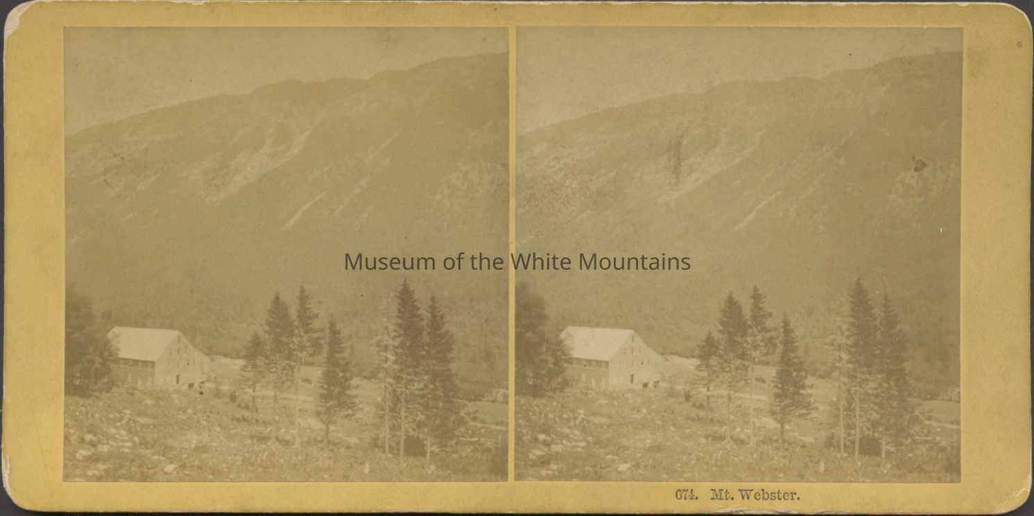 Black and white image of a building and clearing along a dirt road with mountains in the background. Caption reads, "Mt. Webster." Back Description: Wood-like pattern.
