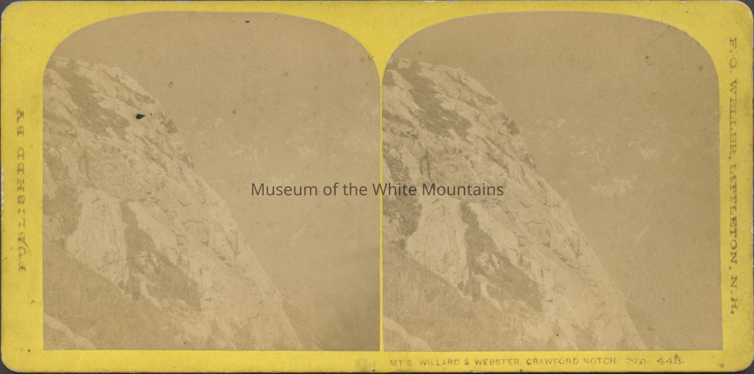 Black and white image of a rocky mountain. Caption reads, "Mts Willard and Webster, Crawford Notch." Back Description: Plain