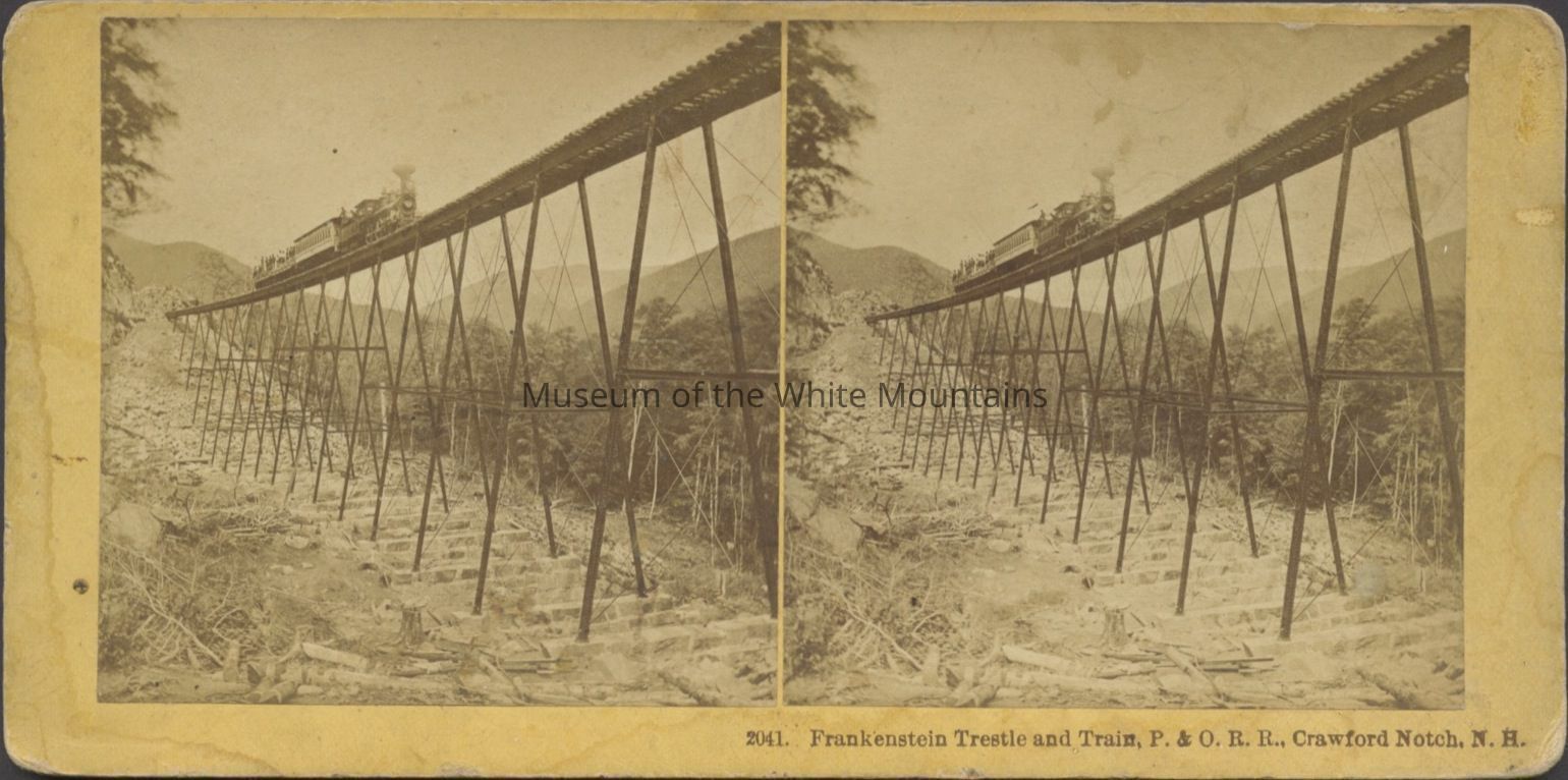 Black and white image of an elevated railroad trestle among mountains. A train is on the tracks. Caption reads, ”Frankenstein Trestle and Train, P. & O. R. R. Crawford Notch NH. " Back Description: Wood-like pattern.