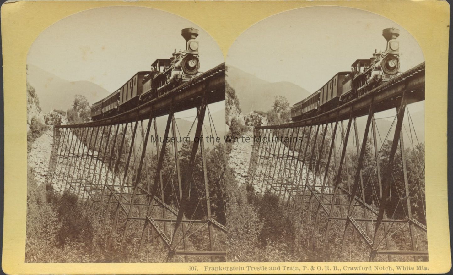 Frankenstein Trestle (Coos county, New Hampshire : structure), Portland and Ogdensburg Railroad, Crawford Notch (New Hampshire : valley), railroad tracks, trains, bridges, mountains, trestlesDimensions