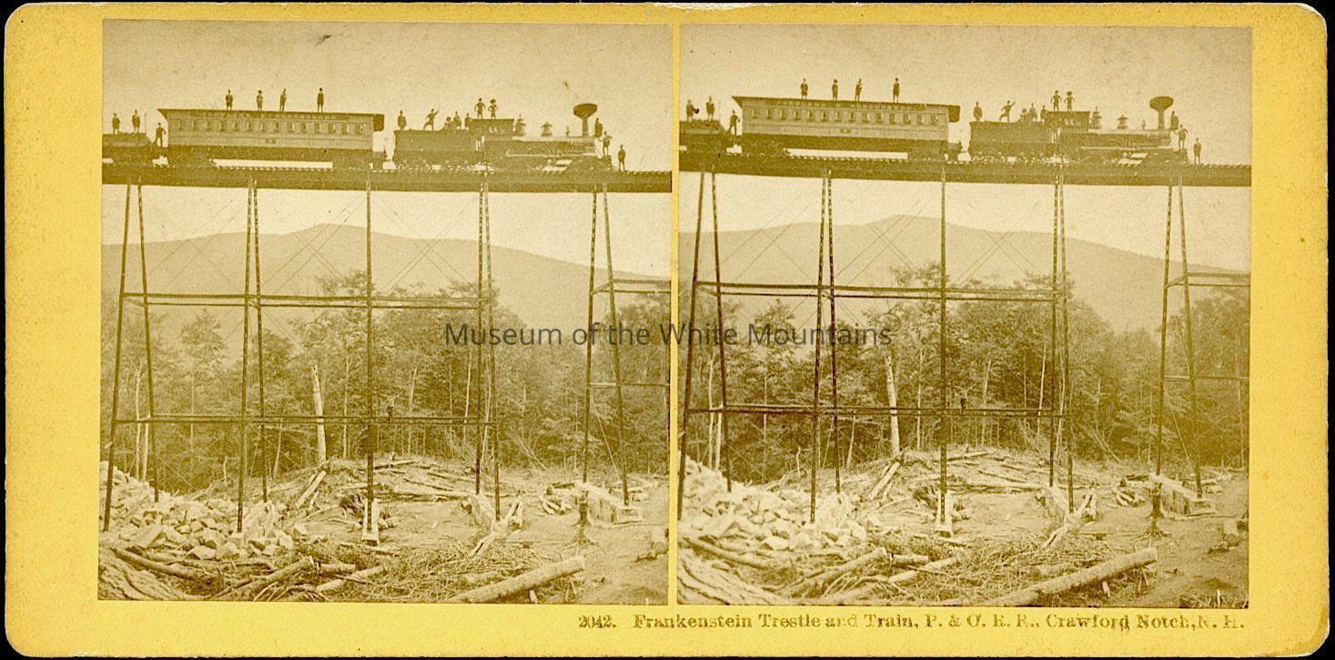 Frankenstein Trestle (Coos county, New Hampshire : structure), Portland and Ogdensburg Railroad, Crawford Notch (New Hampshire : valley), railroad tracks, trains, bridges, mountains, people, logs, trestlesDimensions