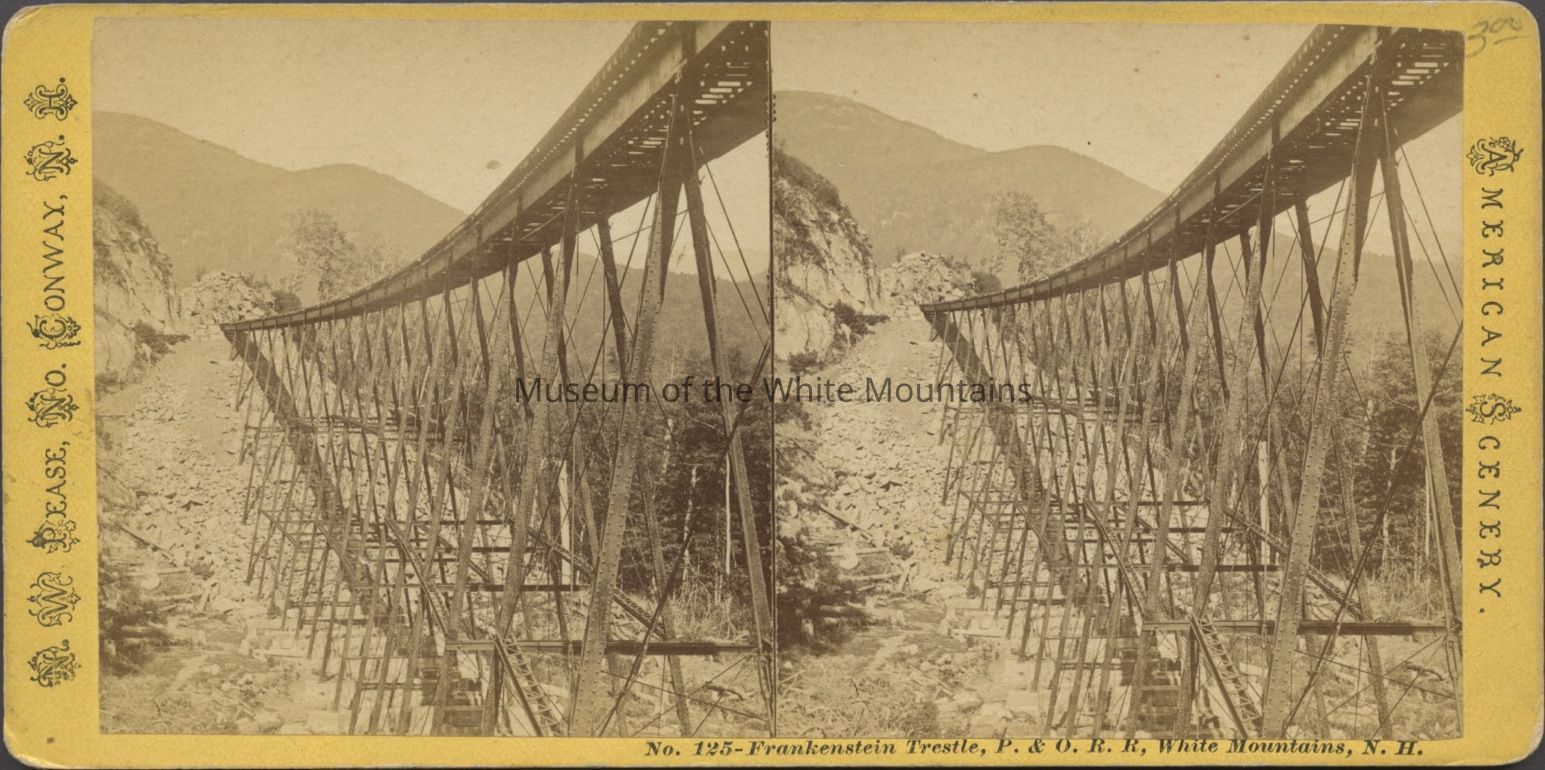 Black and white image of an elevated railroad trestle among mountains. Caption reads, ”Frankenstein Trestle, P. & O. R. R. White Mountains, NH. " Part of the "American Scenery" stereoview series.