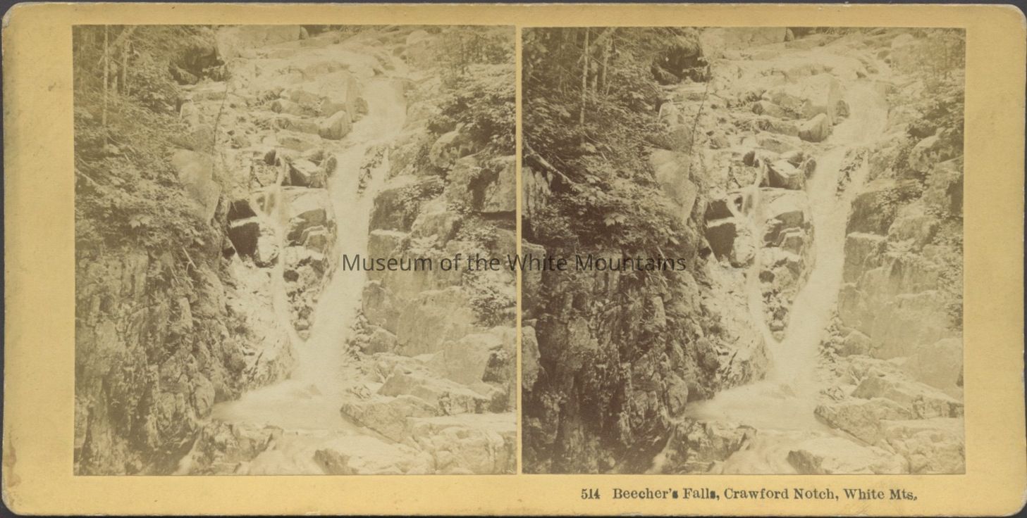 Black and white image of a waterfall among rocks. Caption reads, "Beechers Falls, Crawford Notch, White Mts." Back Description: Plain