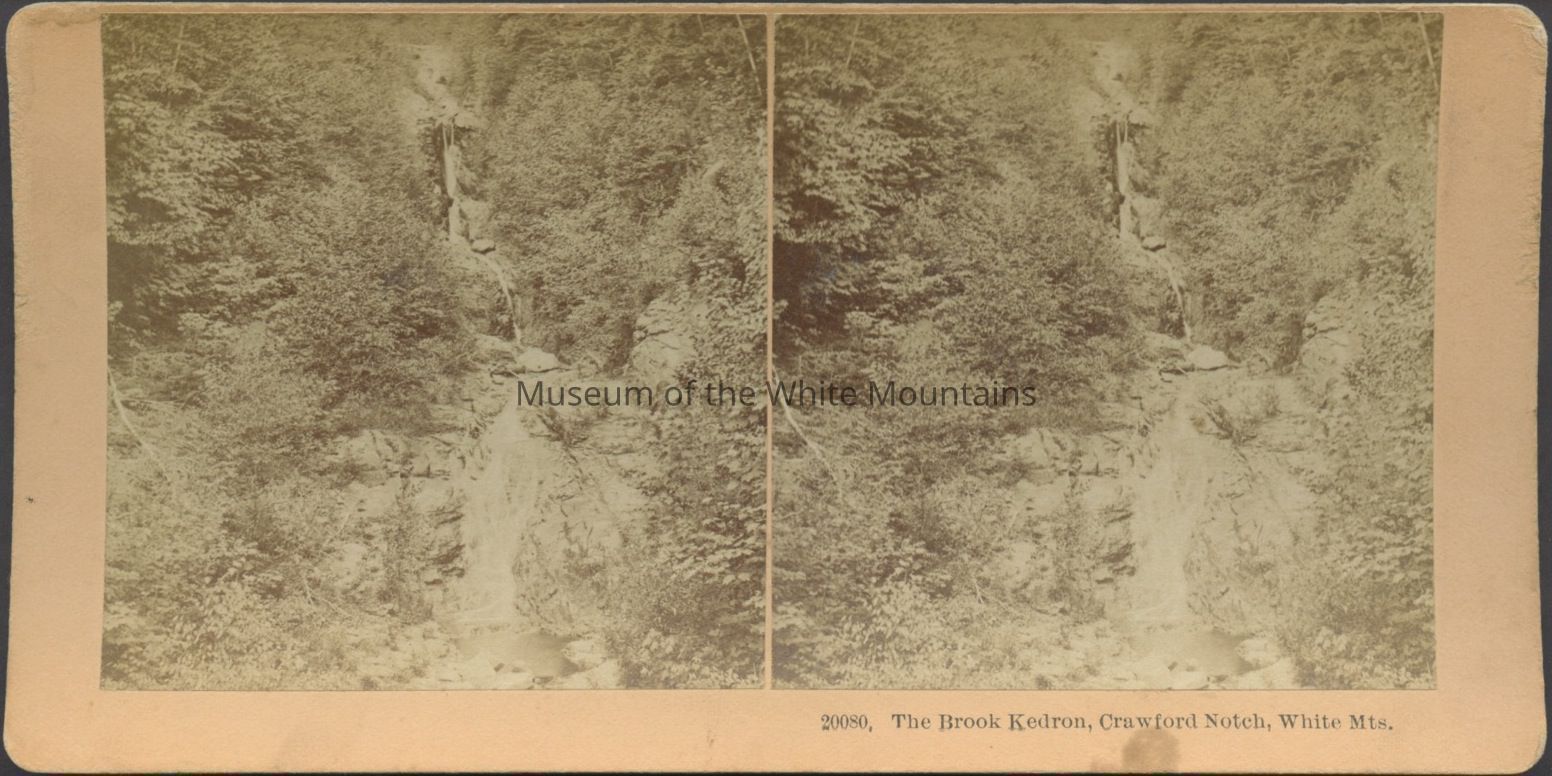 Black and white image of a waterfall among rocks and trees. Caption reads, "The Brook Kedron, Crawford Notch, White Mts."
