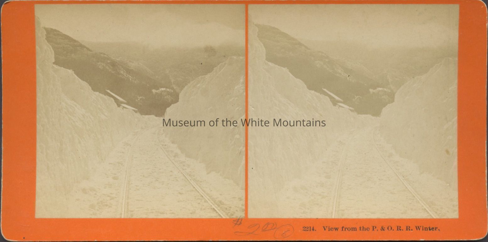 Black and white image of railroad tracks between large snow banks. In the background is a building and mountains. Caption reads, "View from the P and O R R Winter. " Back Description: Plain