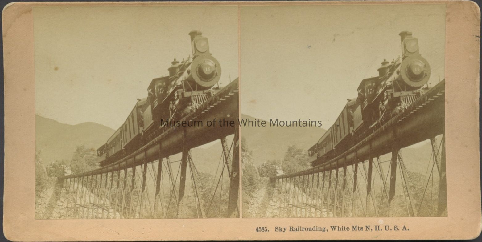 Black and white image of an elevated railroad trestle among mountains. A train is on the tracks. Caption reads, ”Sky Riding, White Mts USA. " Back Description: Plain