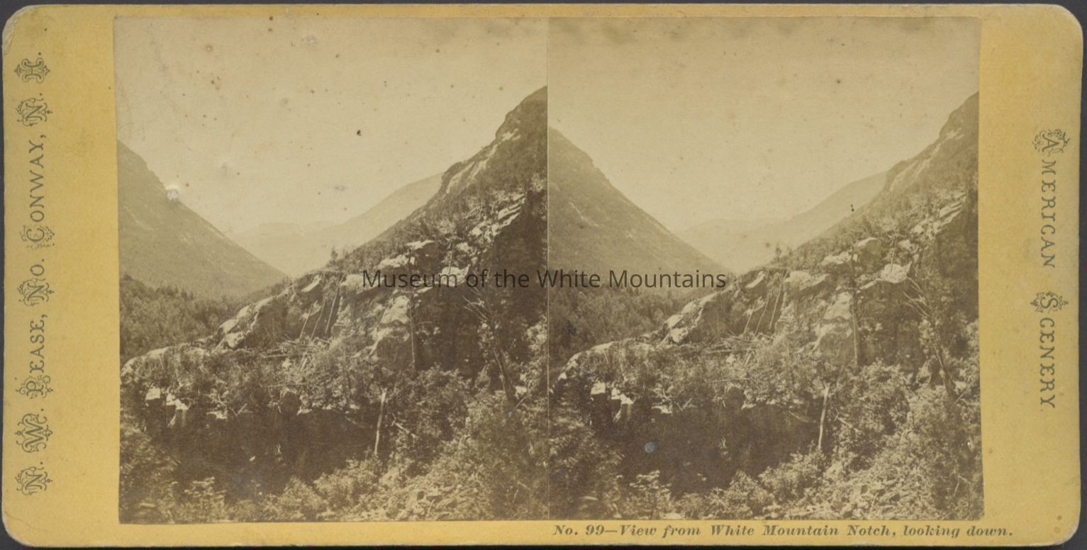 Black and white image of mountains. Caption reads, "View from White Mountain Notch, looking down." Part of the "American Scenery" stereoview series. Back Description: Plain