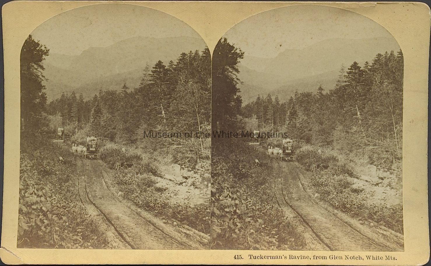 Black and white image of a dirt road with horse-drawn carriages going down it towards mountains. Caption reads, "Tuckermans Ravine from Glen Notch White Mts." Back Description: Plain