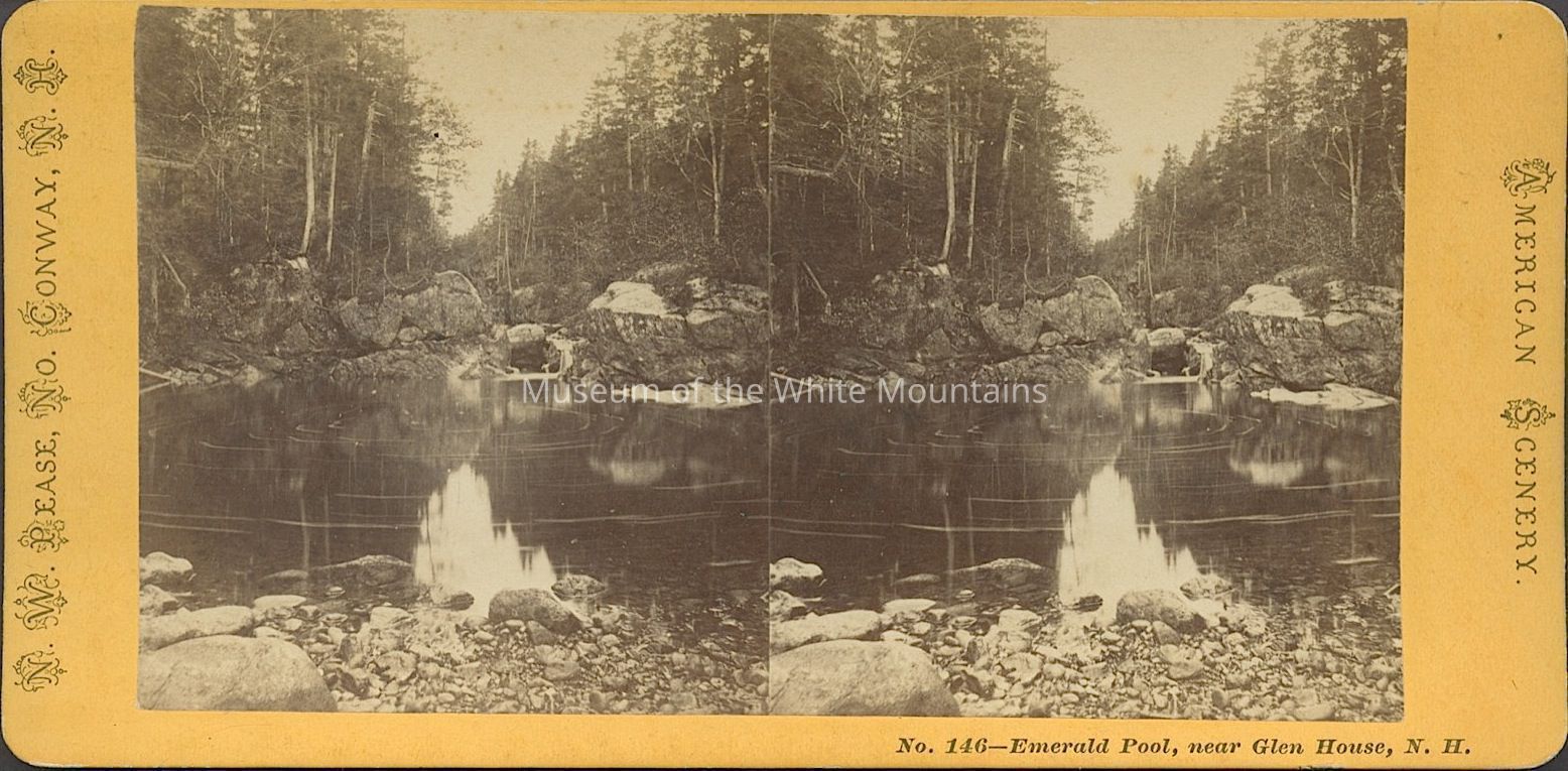 Black and white image of a lake surrounded by rocks and trees. Caption reads, "Emerald Pool, near Glen House NH." Part of the "American Scenery" stereoview series. Back Description: Plain