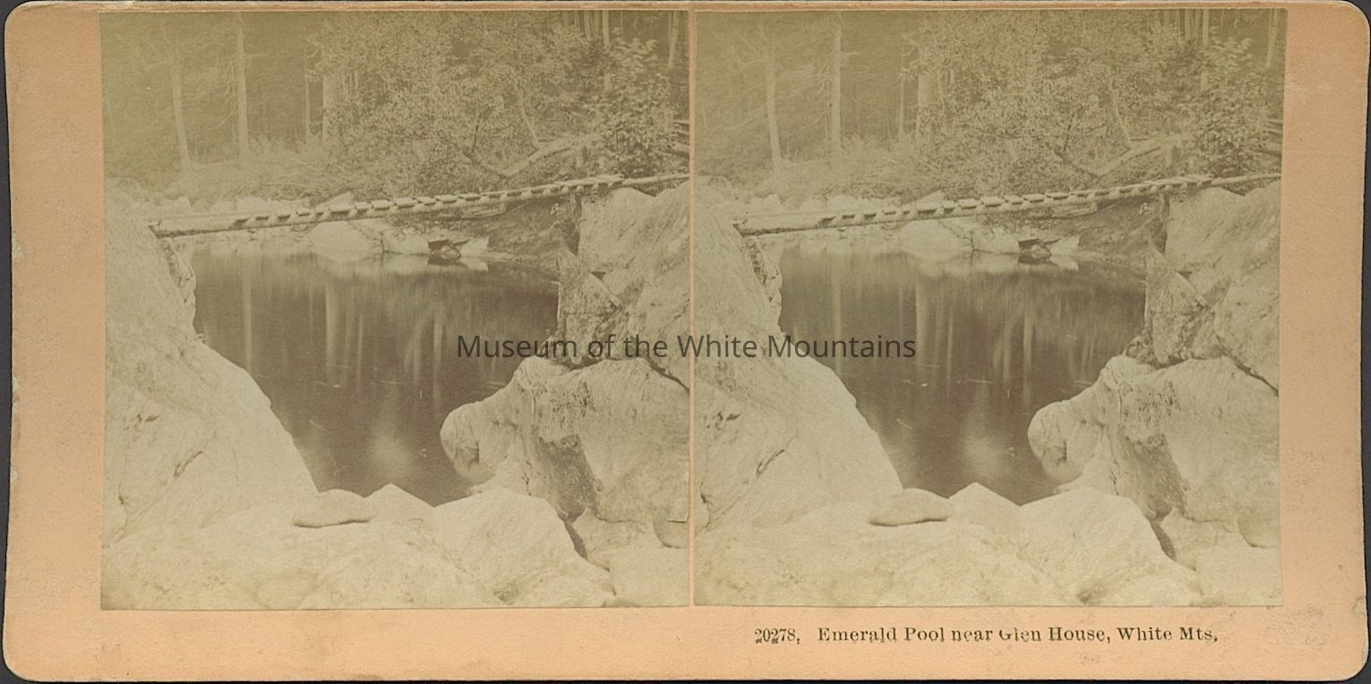Black and white image of a pool surrounded by trees and rocks with a footbridge going across it. Caption reads, "Emerald Pool near Glen House, White Mts." Back Description: Plain