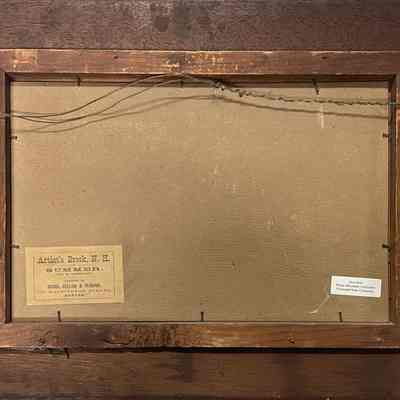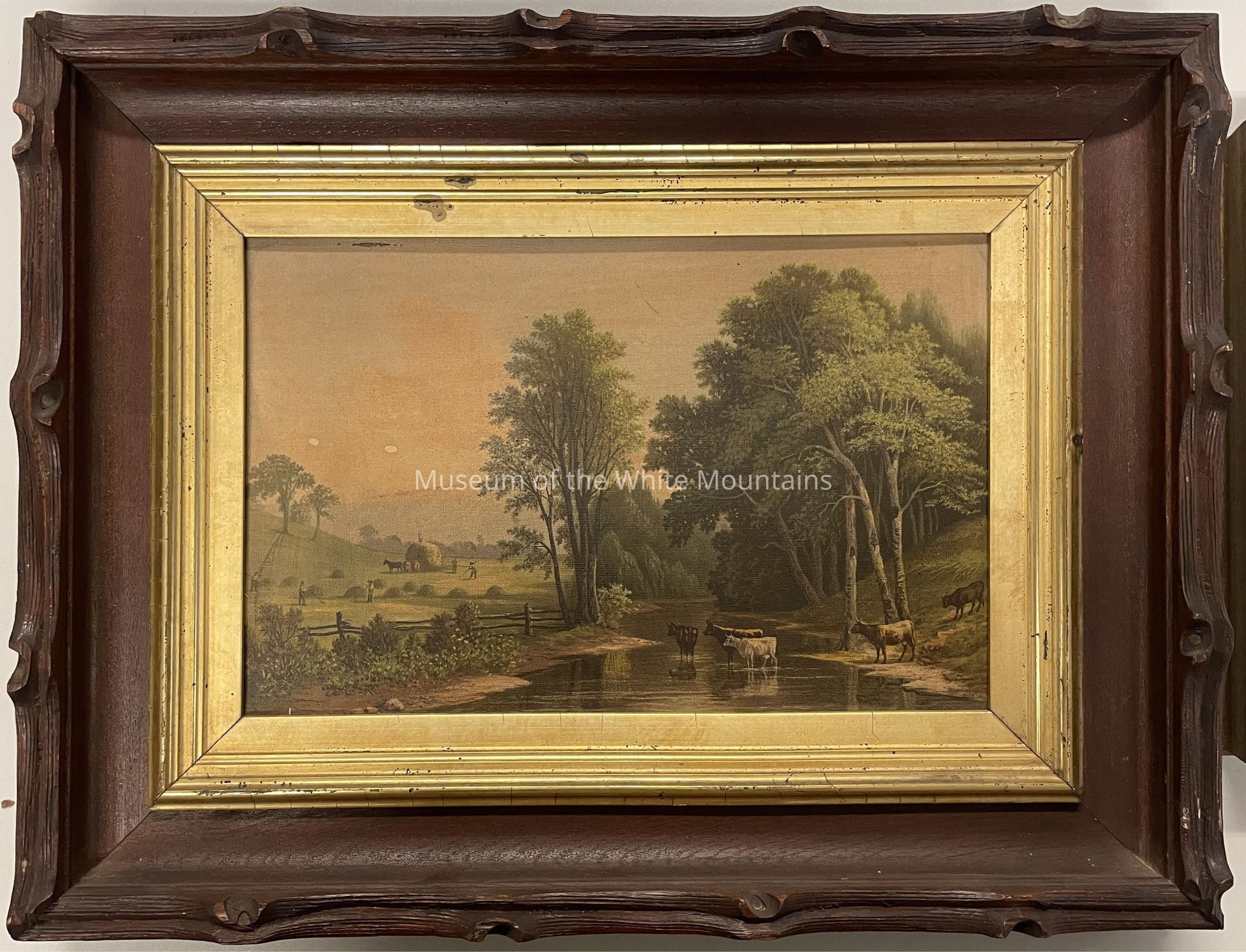 Landscape beholding a shallow river with dense tree cover lining the banks being crossed by cattle towards a farmstead field in the process of being harvested. The field separated from the river by a wooden fence and the adjacent shore rises with a step incline.Type of Painting