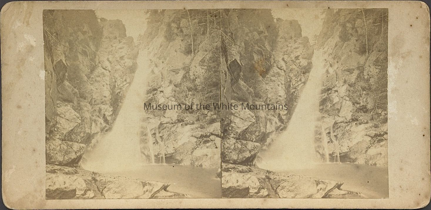 Black and white image of a waterfall among rocks and trees. A pool is in view. Part of the "American Scenery" stereoview series. Back Description: Plain. Caption reads, "Glen Ellis Falls." Typing has been crossed out. Stamped with, "Jackson."