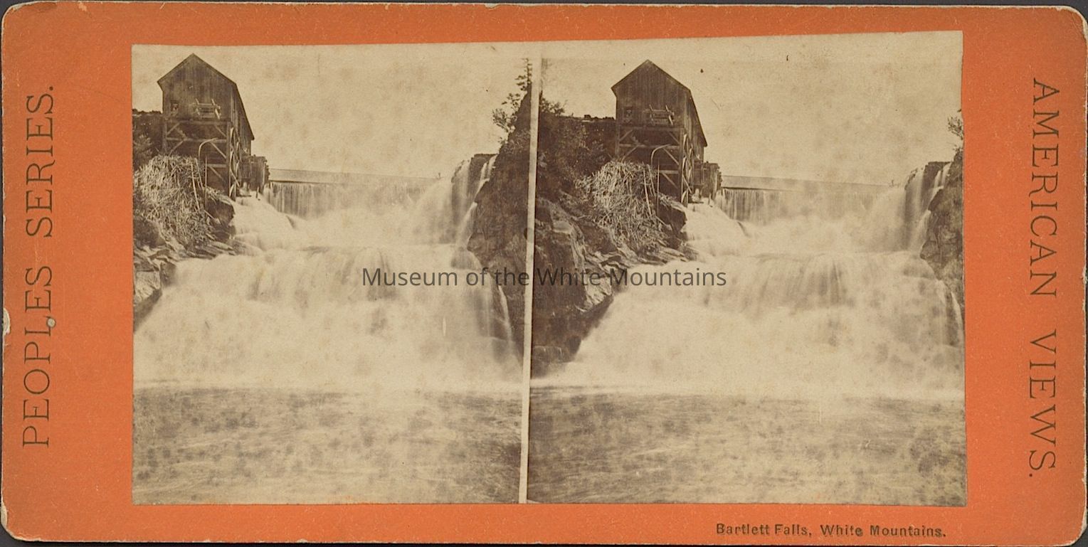 Black and white image of a waterfall among rocks and a building. Caption reads, "Bartlett Falls, White Mountains." Part of the "People Series, American Views" stereoview series Back Description: Plain
