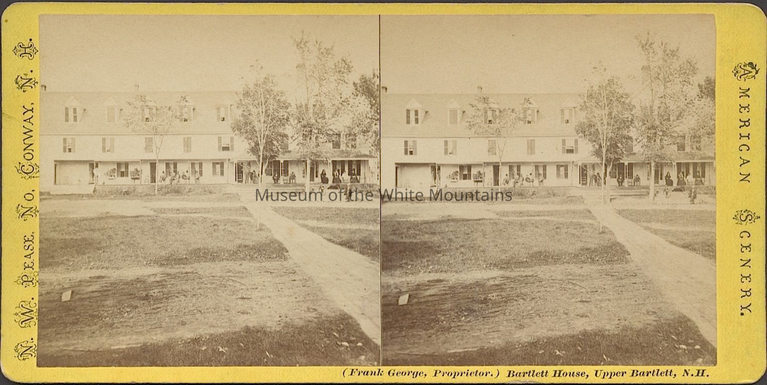 Black and white image of a dirt path leading to a large hotel with many people on its porch. Caption reads, "(Frank George, Proprietor) Bartlett House, Upper Bartlett NH." Part of the "American Scenery" stereoview series.