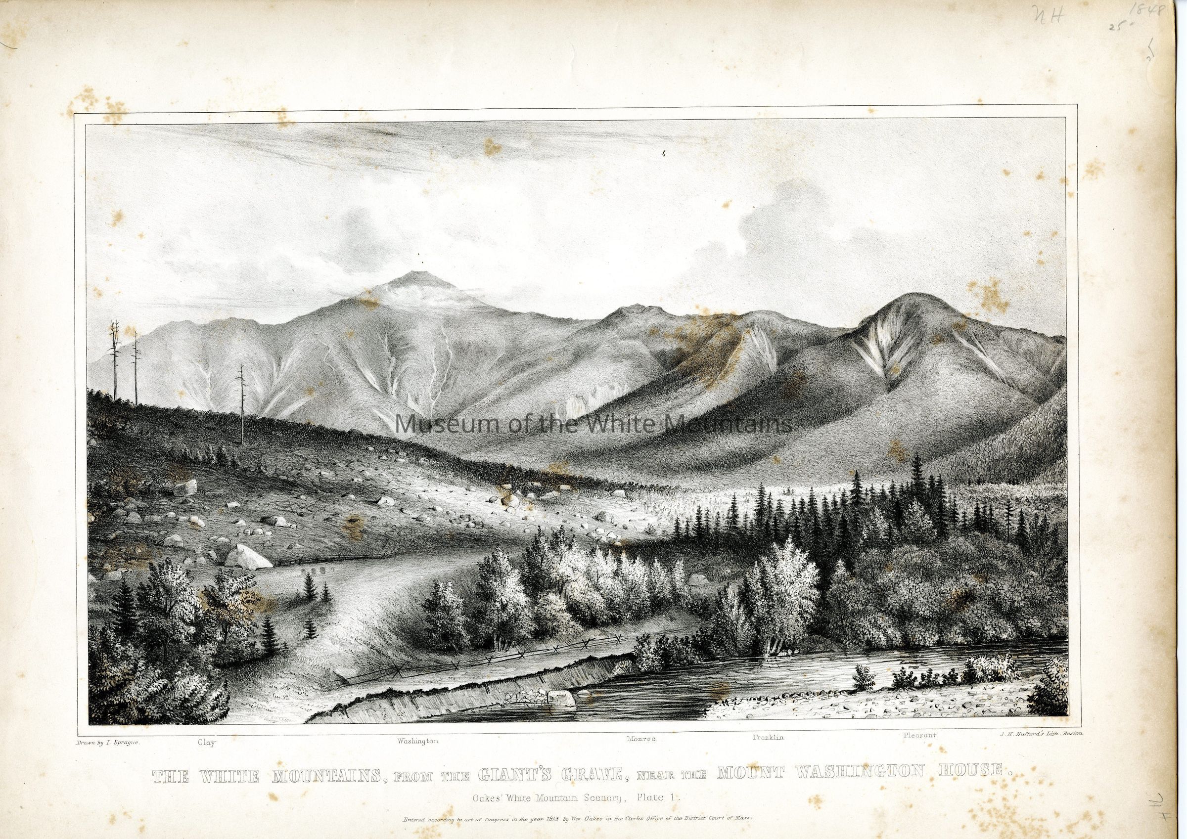 THE WHITE MOUNTAINS, FROM THE GIANT'S GRAVE, NEAR THE MOUNT WASHINGTON HOUSE. / Oakes' White Mountain Scenery, Plate 1. / Entered according to act of Congress in the year 1848 by William Oakes in the Clerks Office of the District Court of Massachusetts.Type