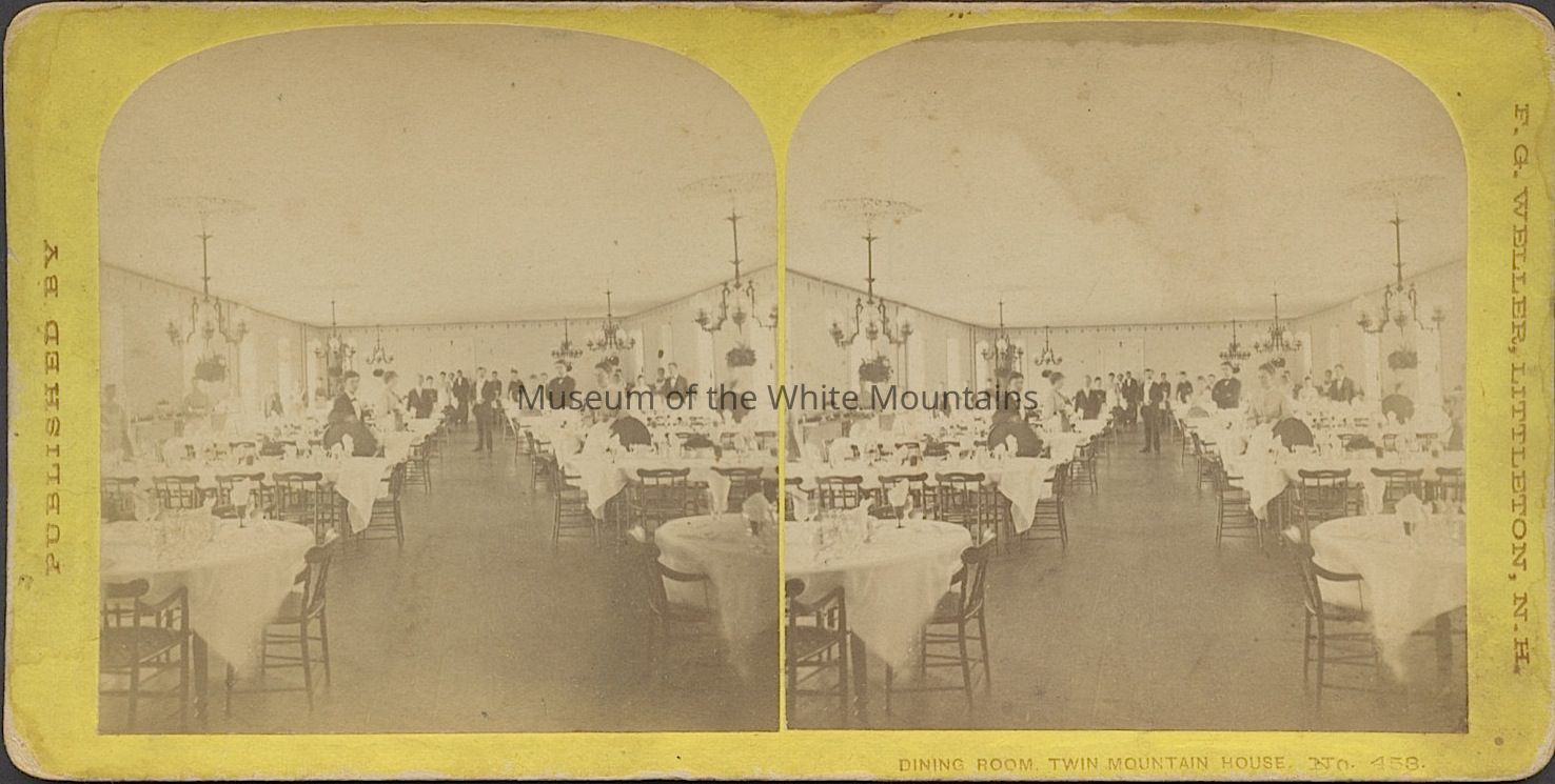 Twin Mountain House (Coos county, New Hampshire : inhabited place), Carroll (Coos county, New Hampshire : inhabited place), interiors, dining rooms, hotels, people, furniture
