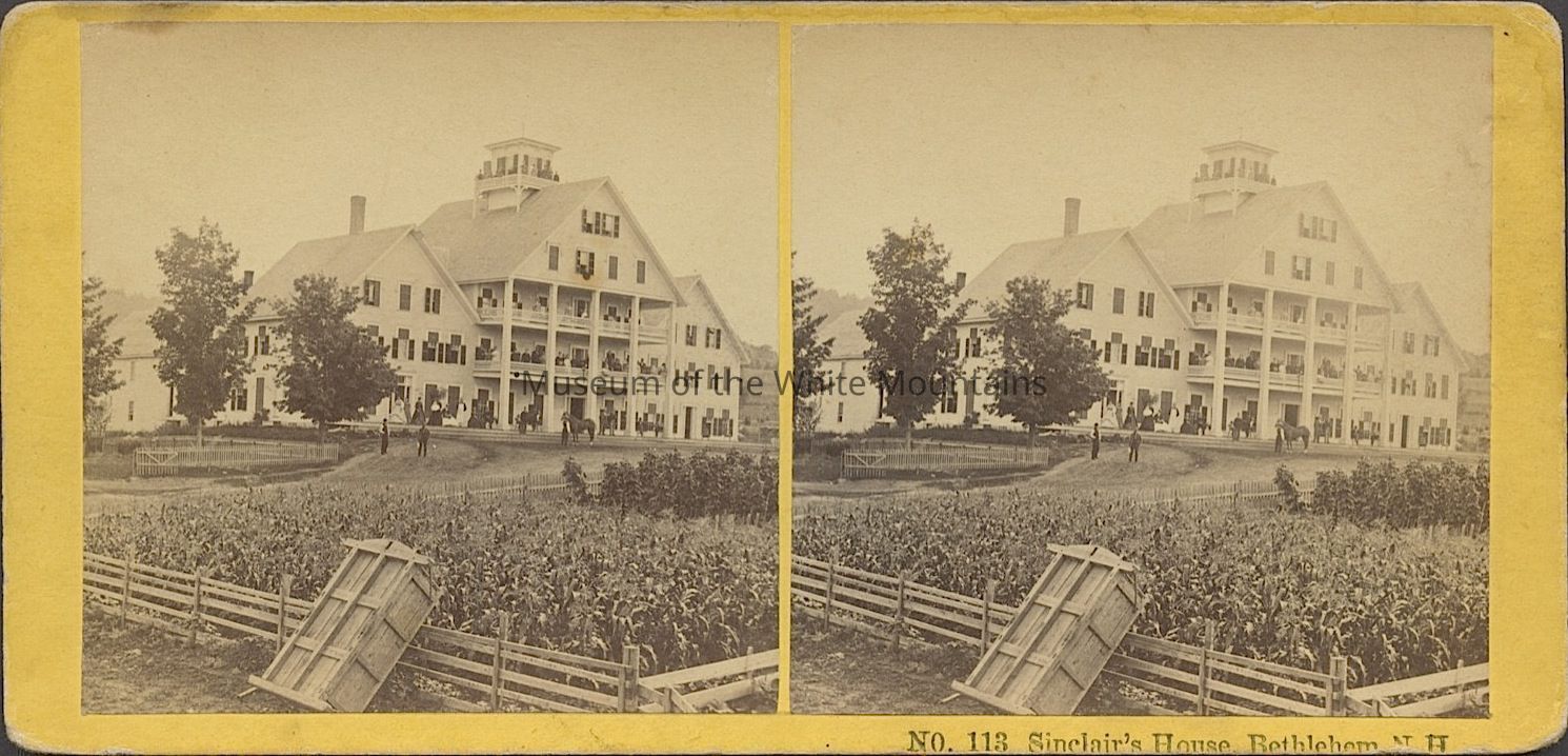 Black and white image of a four story building with a three story deck and a square cupola. It is flanked by two more three story buildings. Many people are on the porches and out front. A fenced-in clearing is in view as well as crops and horses. Caption reads "Sinclair's House. Bethlehem, N.H." Back Description: Plain