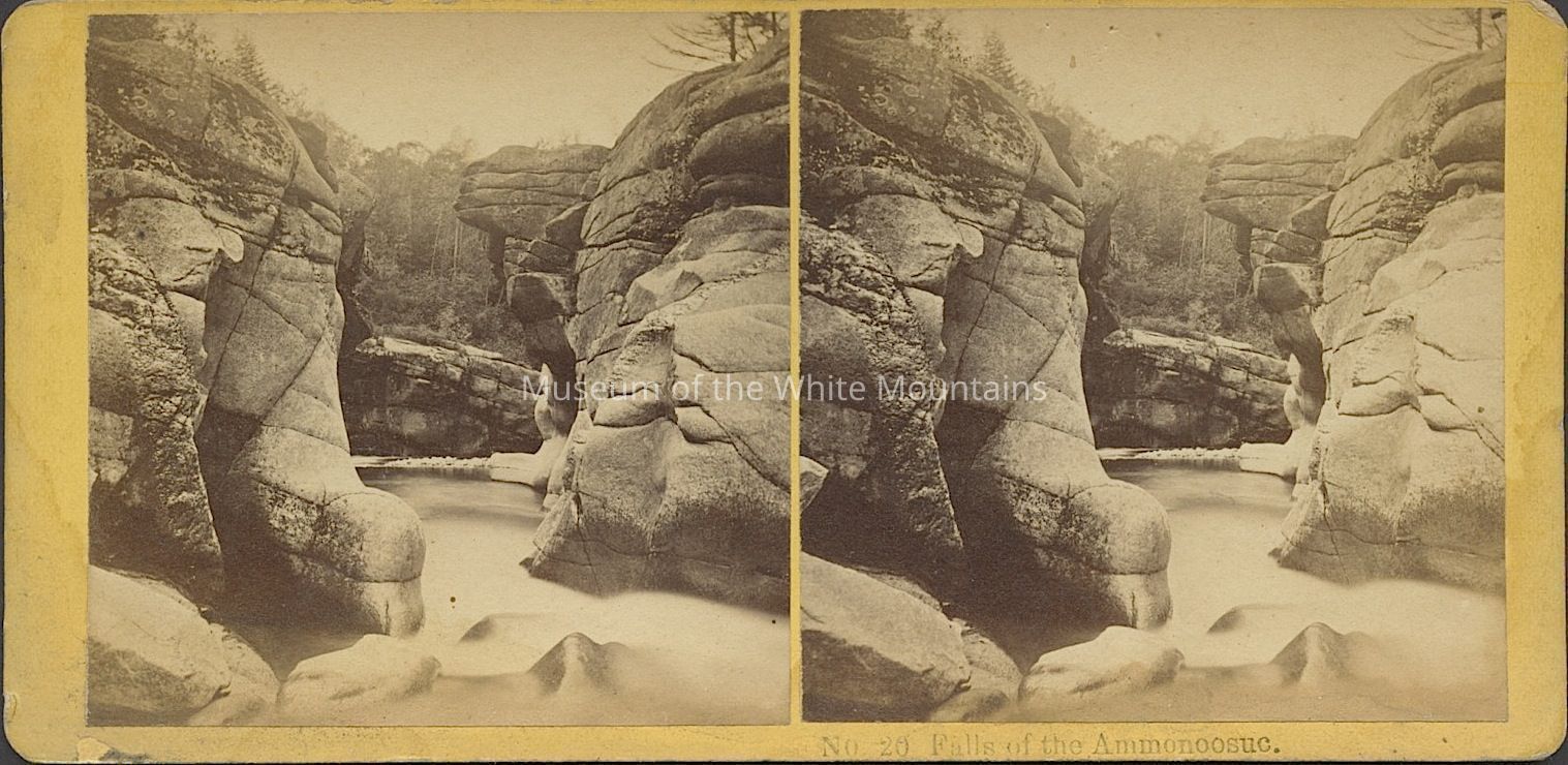 Black and white image of a pool among rocks. Caption reads, "Falls of the Ammonoosuc." Back Description: Plain. With writing.